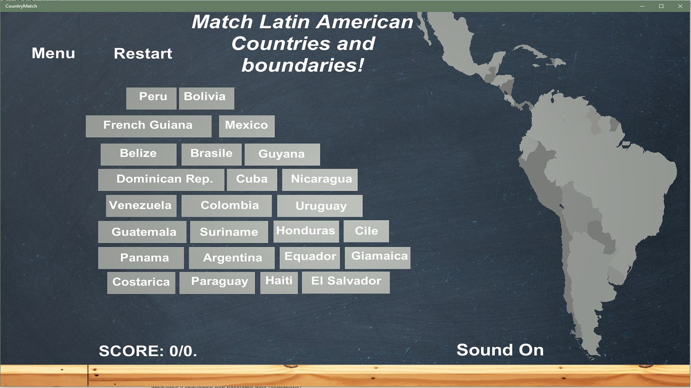CountryMatchLatinAmerica is an educational game that will test your geography skills. You will have to associate each country with its position in the map. First you have to click on the name of the country and then on the position on the map. If the match is right you gain a point. If it is wrong you gain an error. When you have clear the stage, you can see your score and the teacher comment.