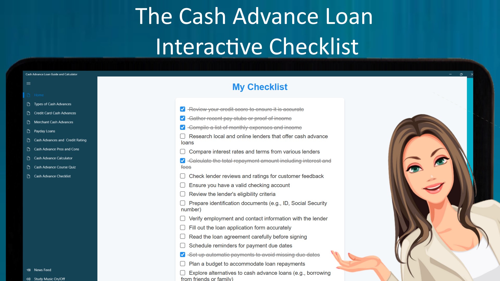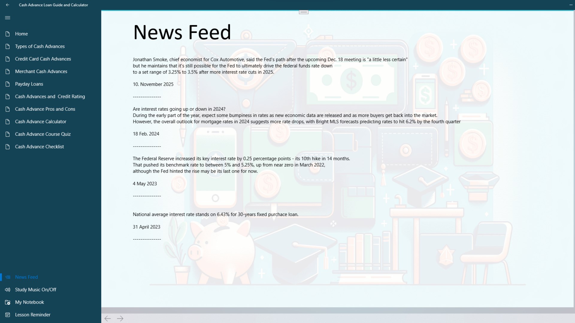 Types of Cash AdvancesCredit Card Cash AdvancesMerchant Cash AdvancesPayday LoansCash Advances and Credit RatingCash Advance Pros and ConsCash Advance Detailed CalculatorCash Advance Course QuizCash Advance Interactive ChecklistInteractive Notebook: Take notes directly in the app as you learn. Lesson Scheduling System: Stay on track with customized lesson reminders. Studying Music player.Real-time News Feed: Stay up-to-date with the latest market trends and news. Goal-Setting Questionnaire: Boost your motivation by setting clear, achievable goals.