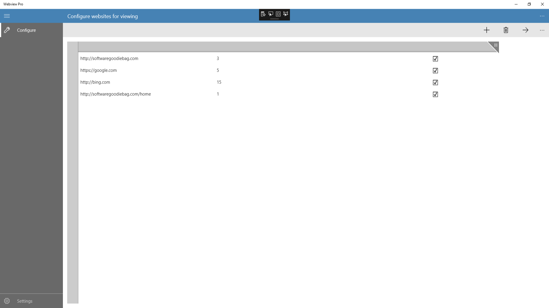 Webview Pro is a very simple piece of software which allows you view and cycle through multiple websites. Perfect for advertising or cycling through dashboards.