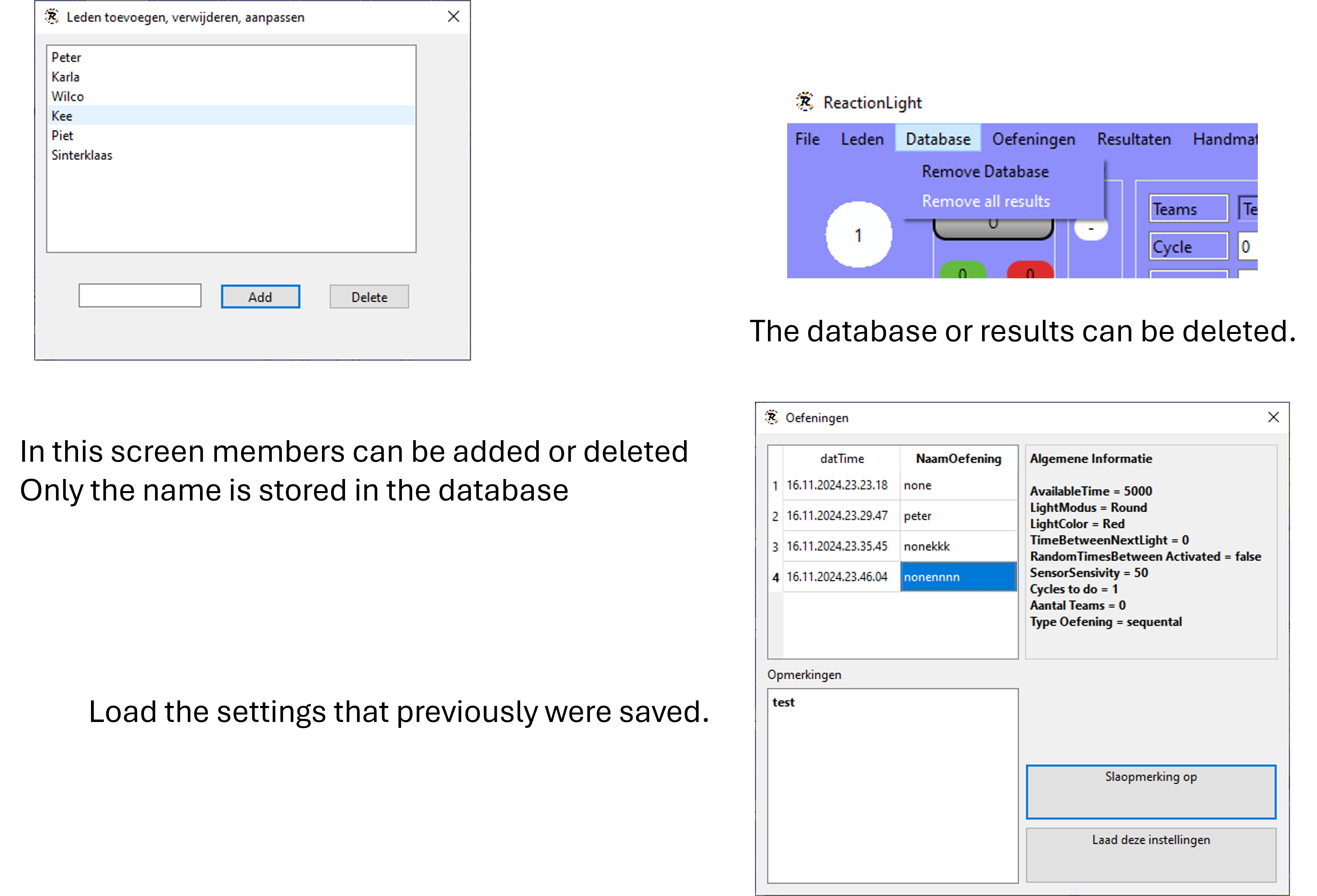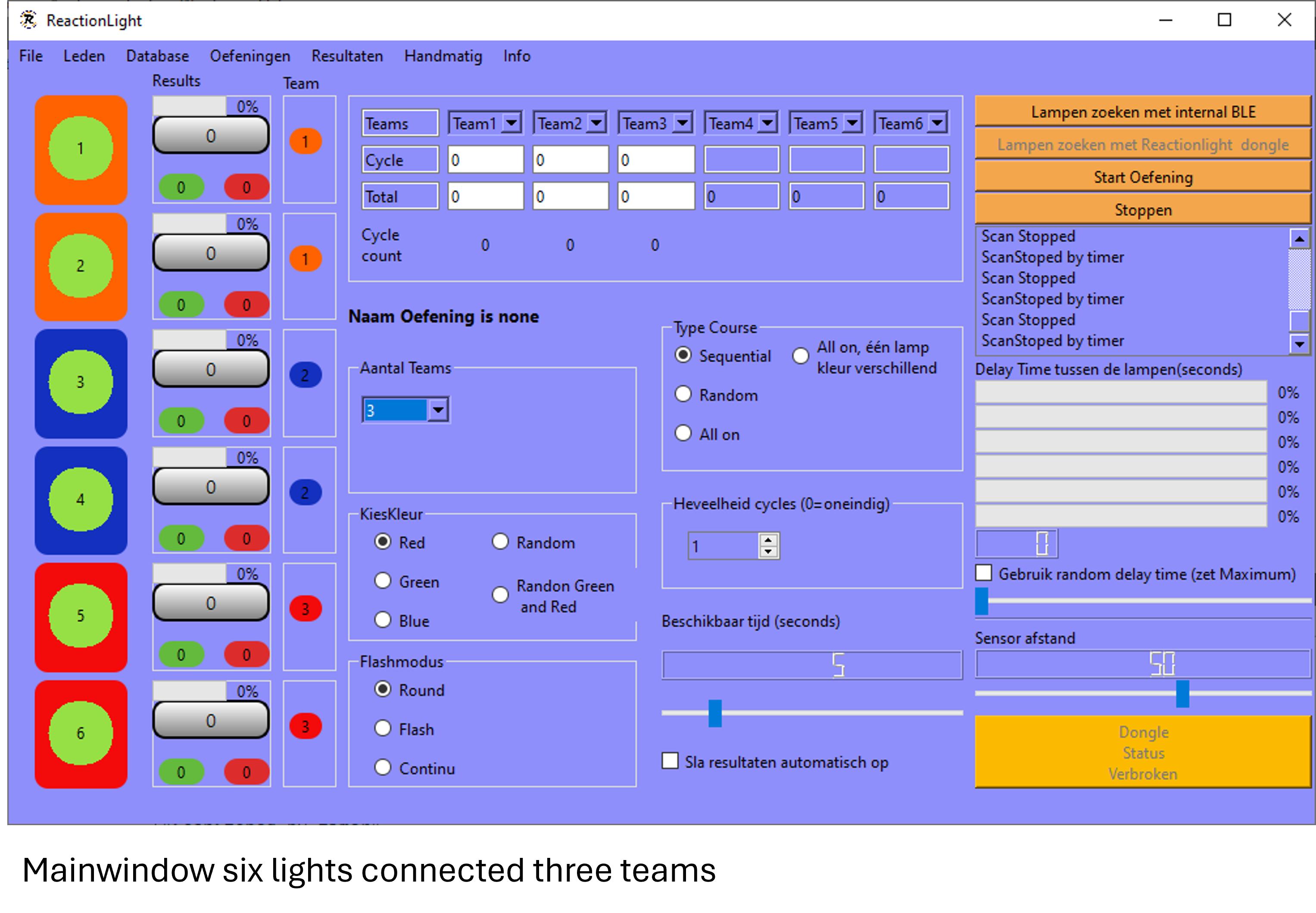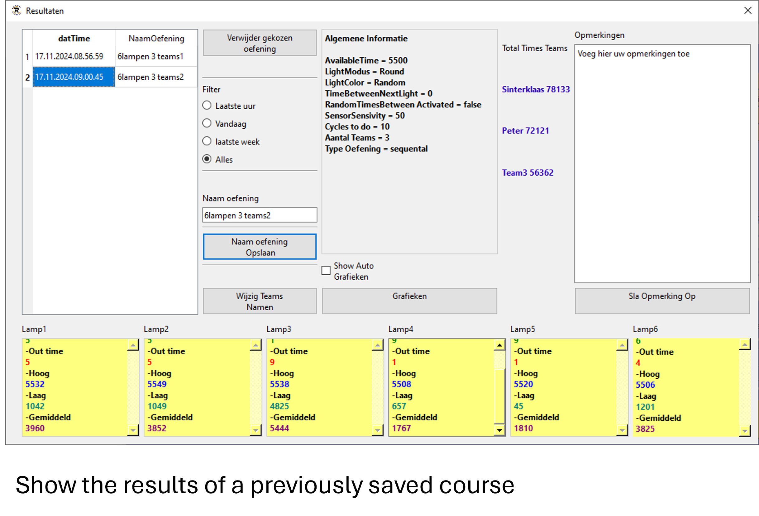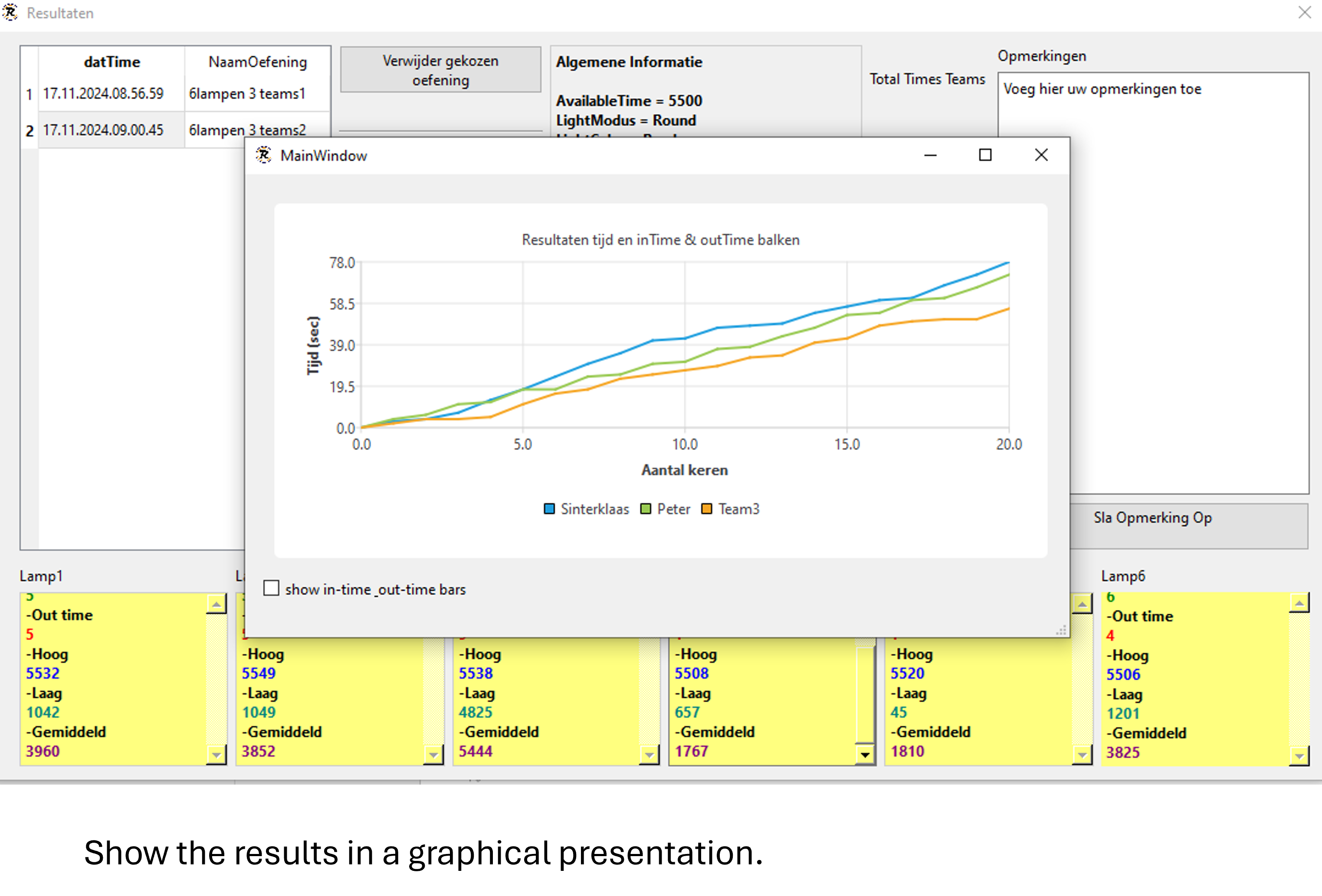 The app keeps track of all the results from all teams and can also store the results in a database and make charts from the results.