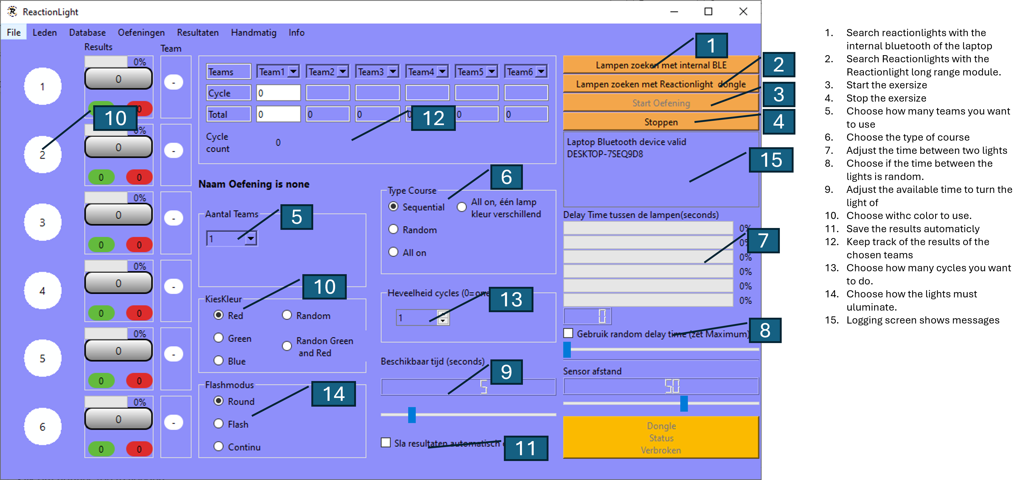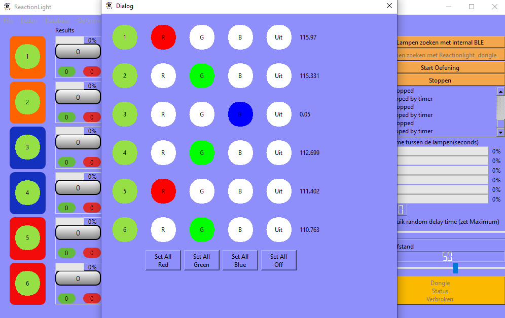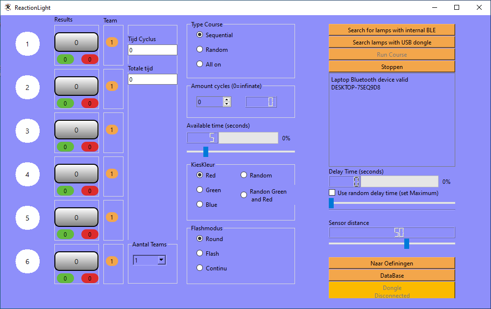 The app sends a message via the internal bluetooth of the laptop to the lights to set them on, when the (laser)sensor of the Reactionlight detects an object, for example a hand or foot, the light is turned off and sends the time result back to the app.