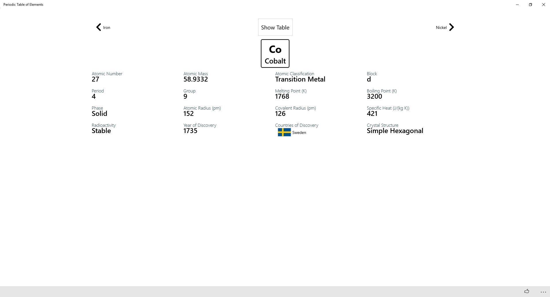 Take a closer look at each element by clicking it on the table. See more details like atomic radius, year and country of discovery, specific heat and more...