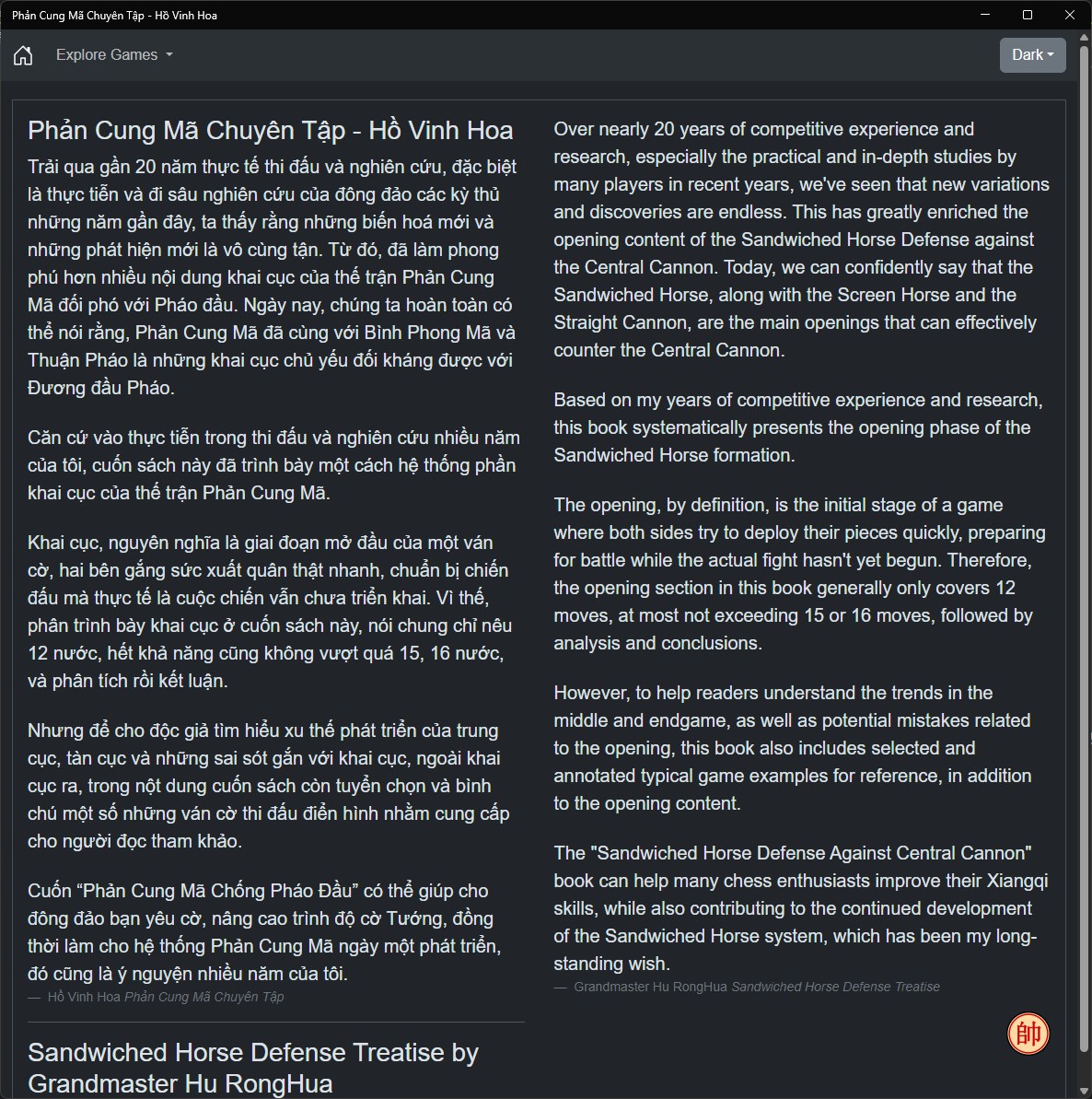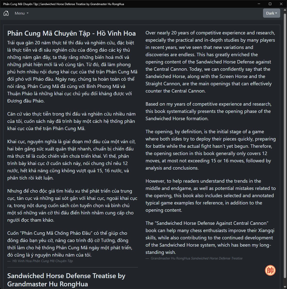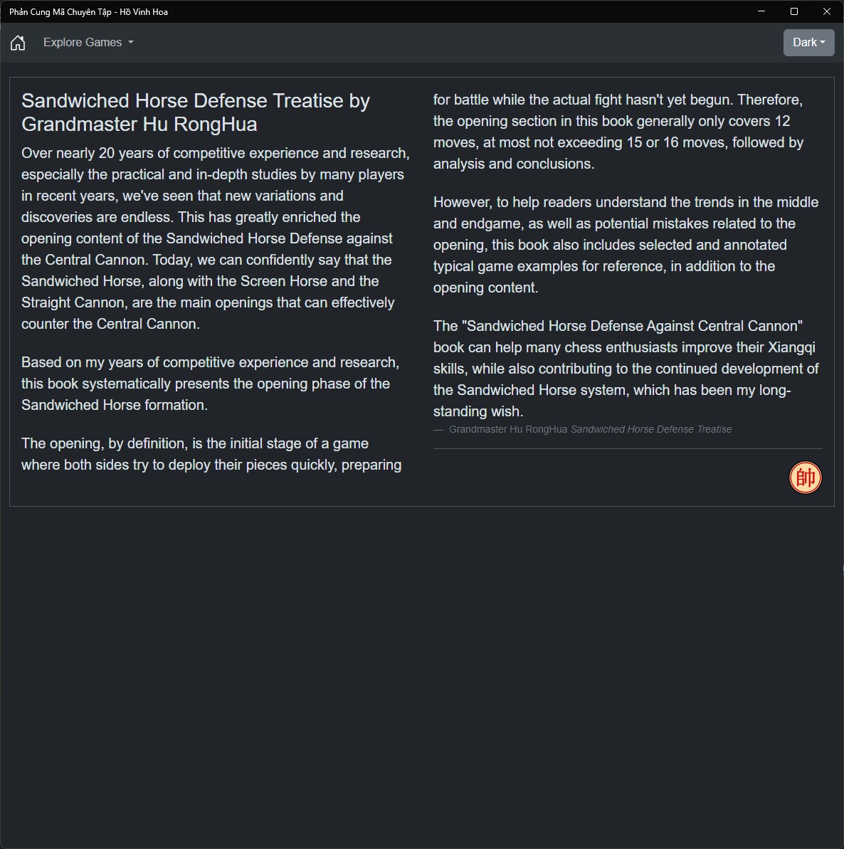 The "Sandwiched Horse Defense Against Central Cannon" book can help many chess enthusiasts improve their Xiangqi skills, while also contributing to the continued development of the Sandwiched Horse system, which has been my long-standing wish.