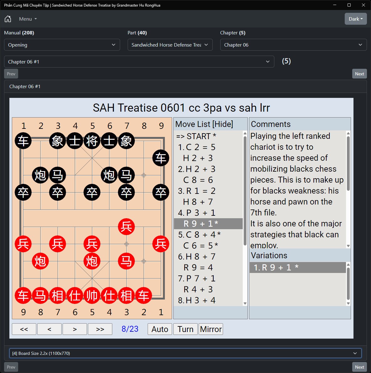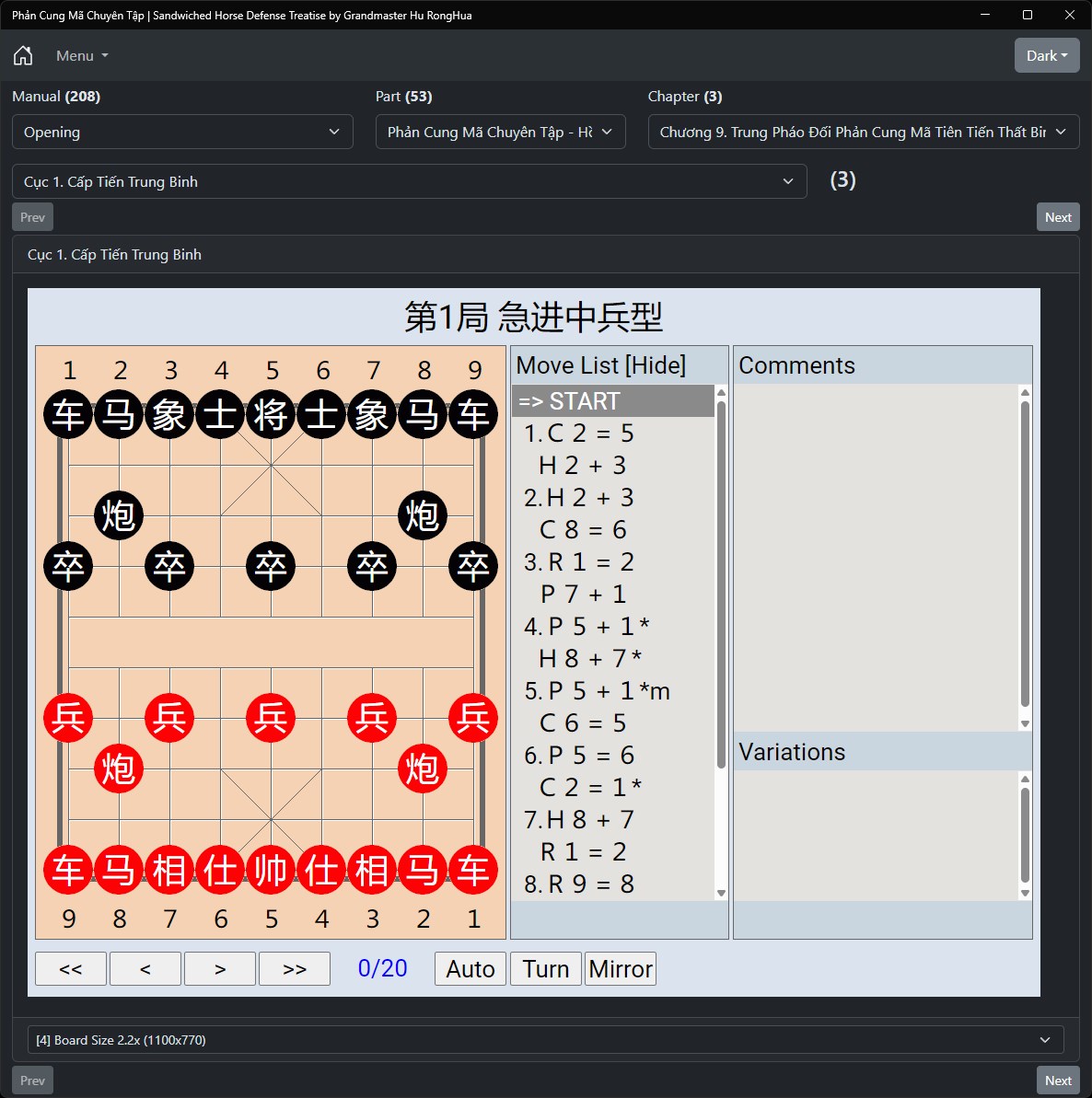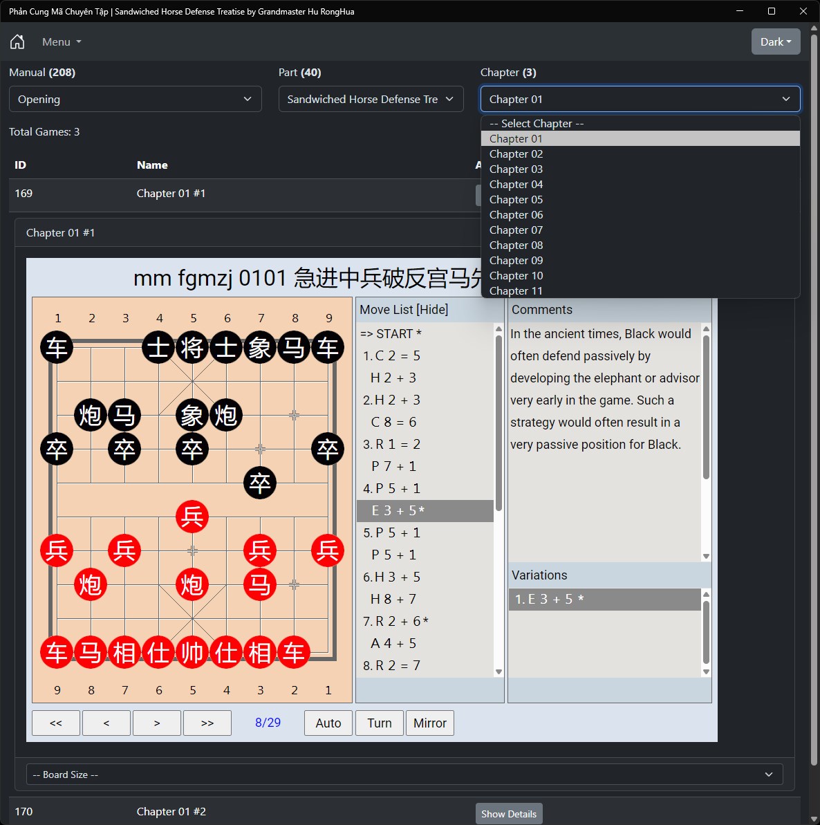 Over nearly 20 years of competitive experience and research, especially the practical and in-depth studies by many players in recent years, we've seen that new variations and discoveries are endless. This has greatly enriched the opening content of the Sandwiched Horse Defense against the Central Cannon. Today, we can confidently say that the Sandwiched Horse, along with the Screen Horse and the Straight Cannon, are the main openings that can effectively counter the Central Cannon.