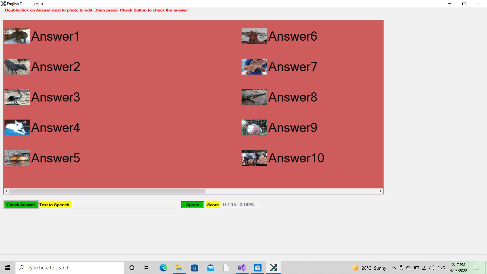 English teaching app that displays a list of 17 images of common animals and the user is required to type the name of the animal the name is checked and if correct a text to speech converter will speak the animal names. Including 16 images of common objects or activities and the user is required to type the name of the object or activity the object or activity is checked and if correct a text to speech converter will speak the object or activities name. Added 7 common fruits.