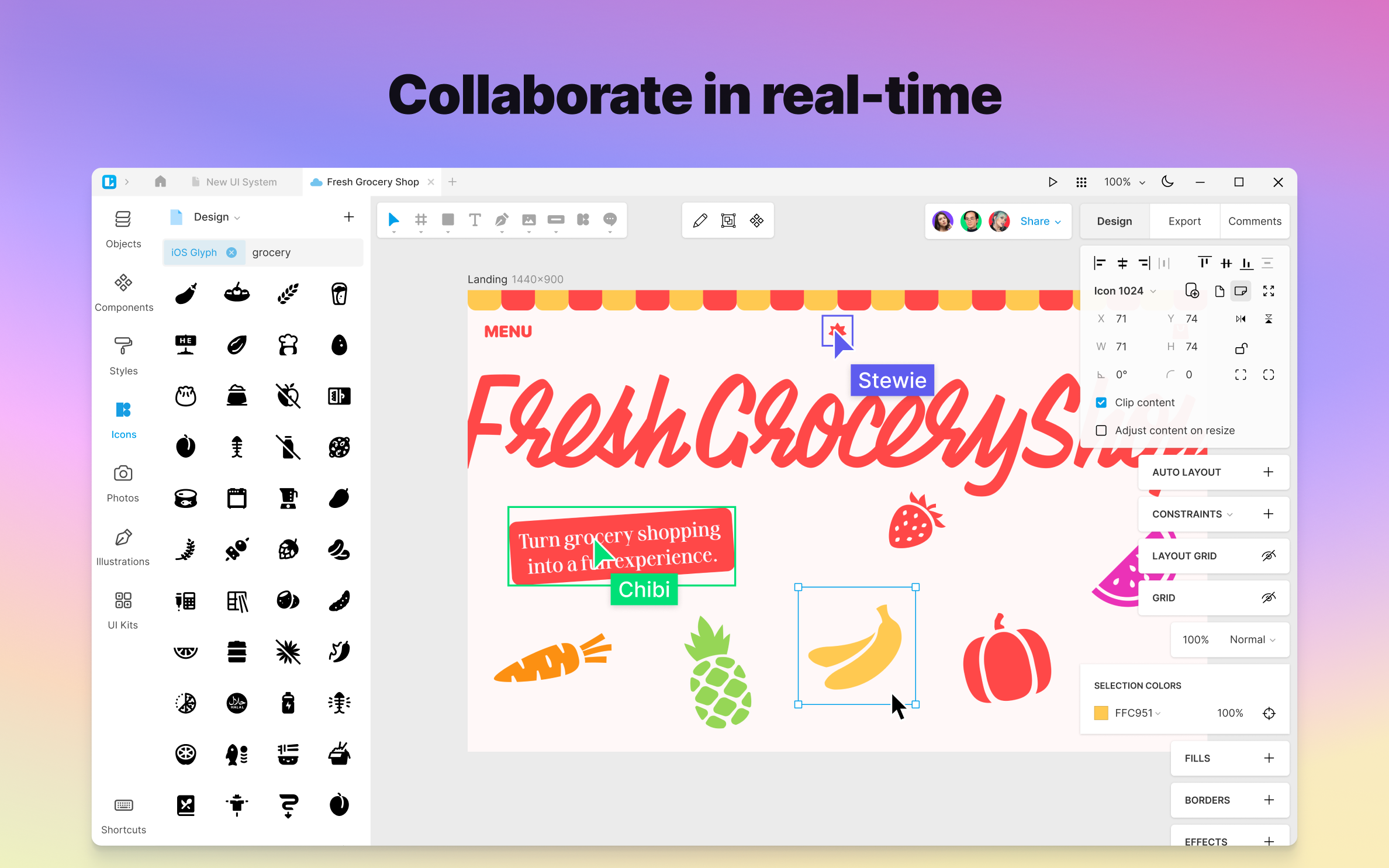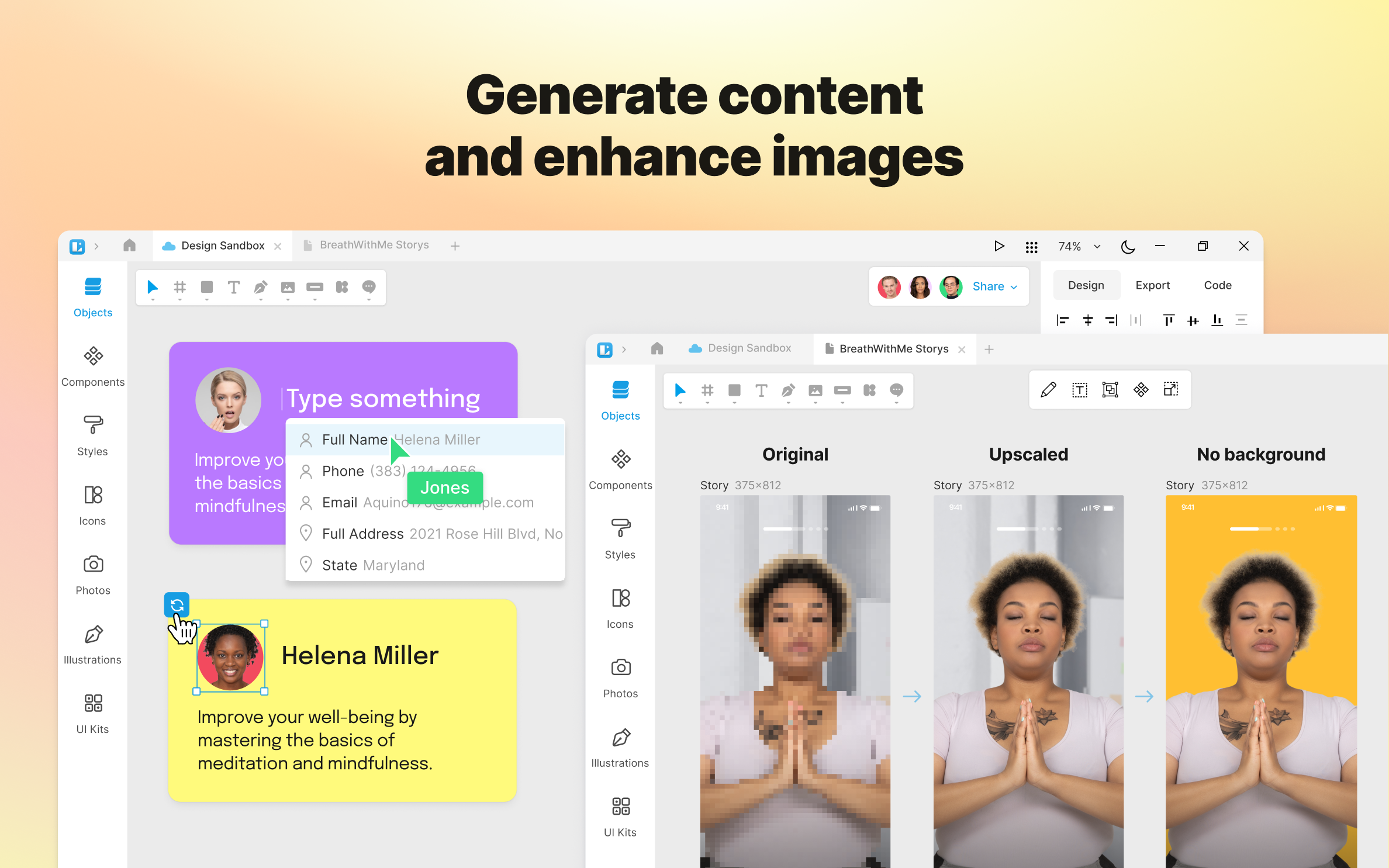 Transform your designs into CSS code and export assets in PNG, SVG, JPEG, PDF, WEBP, TIFF, GIF, and ICO formats in any resolution.