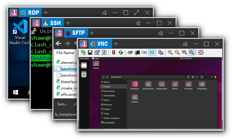 RDP: work with fullscreen, multi-screens, share clipboard...SSH: auto command after connect, changable terminal theme.FTP SFTP: Windows explorer style file transmit servic.VNC: support free vnc protocol.