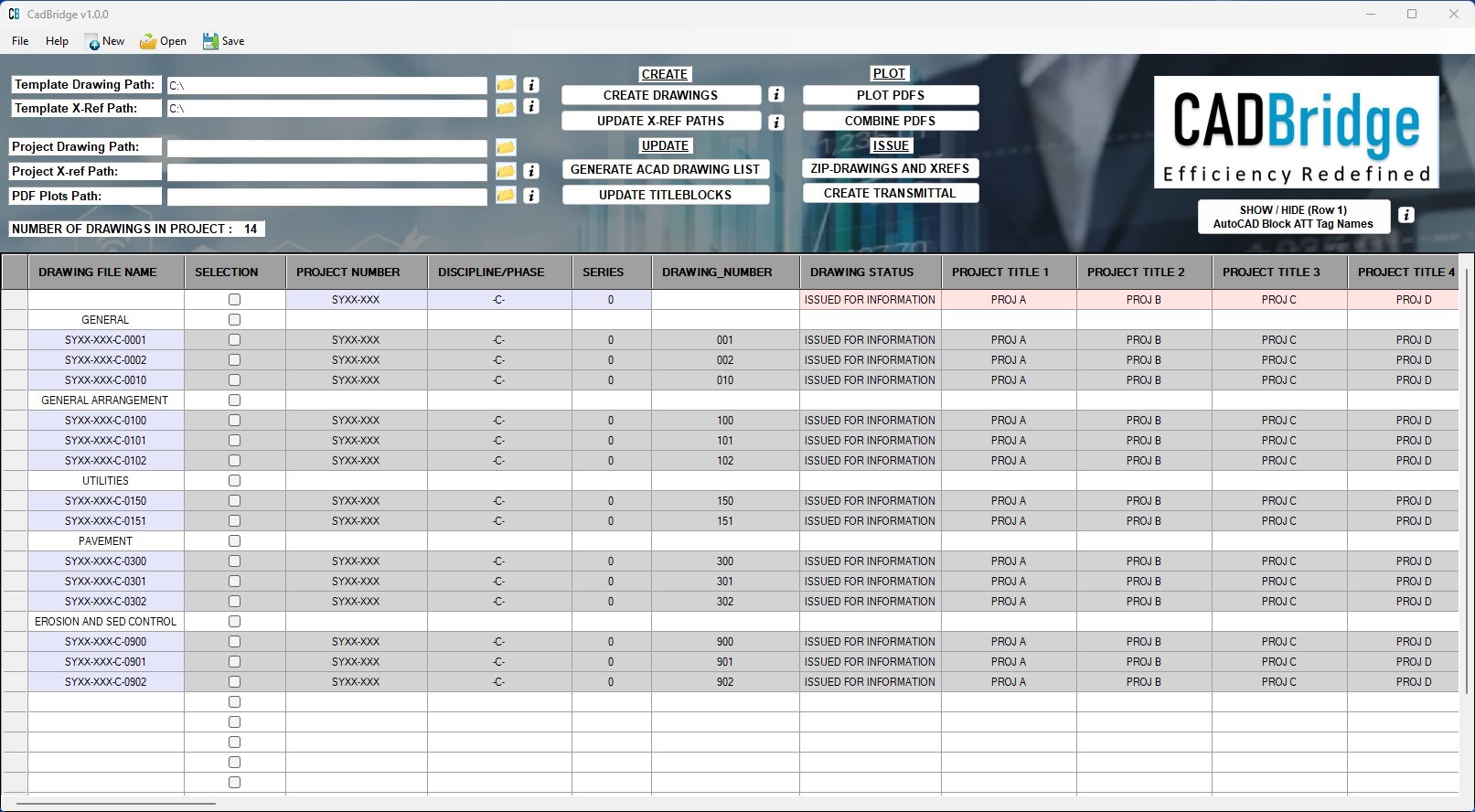 Creates Projects Drawings and External ReferencesUpdates AutoCAD Drawing External Reference Paths Updates AutoCAD Title blocks Creates AutoCAD Drawing listCreates Zip file of Project Drawings and External ReferencesPlots project PDFsCombines project PDFsCreates Drawing Transmittals