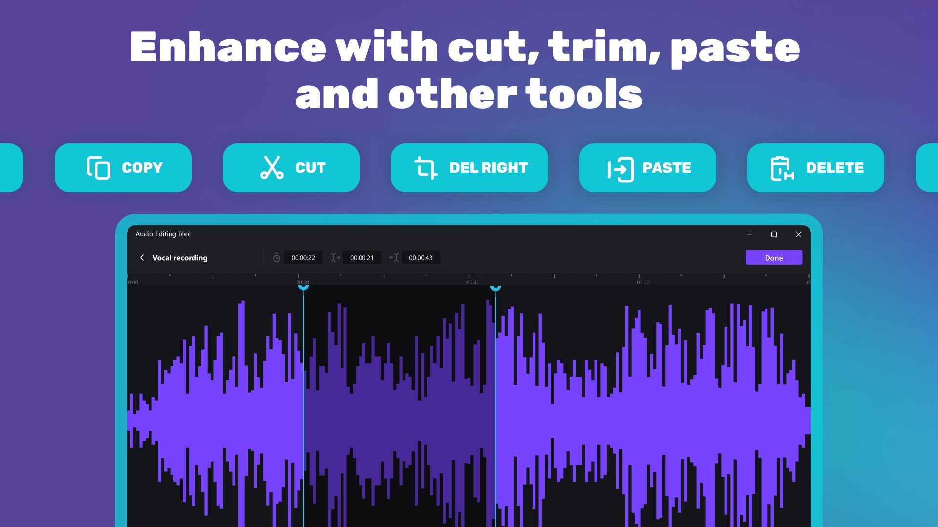 Enjoy a simplified editing process with tools like cut, copy, paste and reverse that let you easily enhance your audio tracks. You can also try out our channel editing feature and fine-tune your sound by adjusting the left or right channel individually or together in stereo mode.