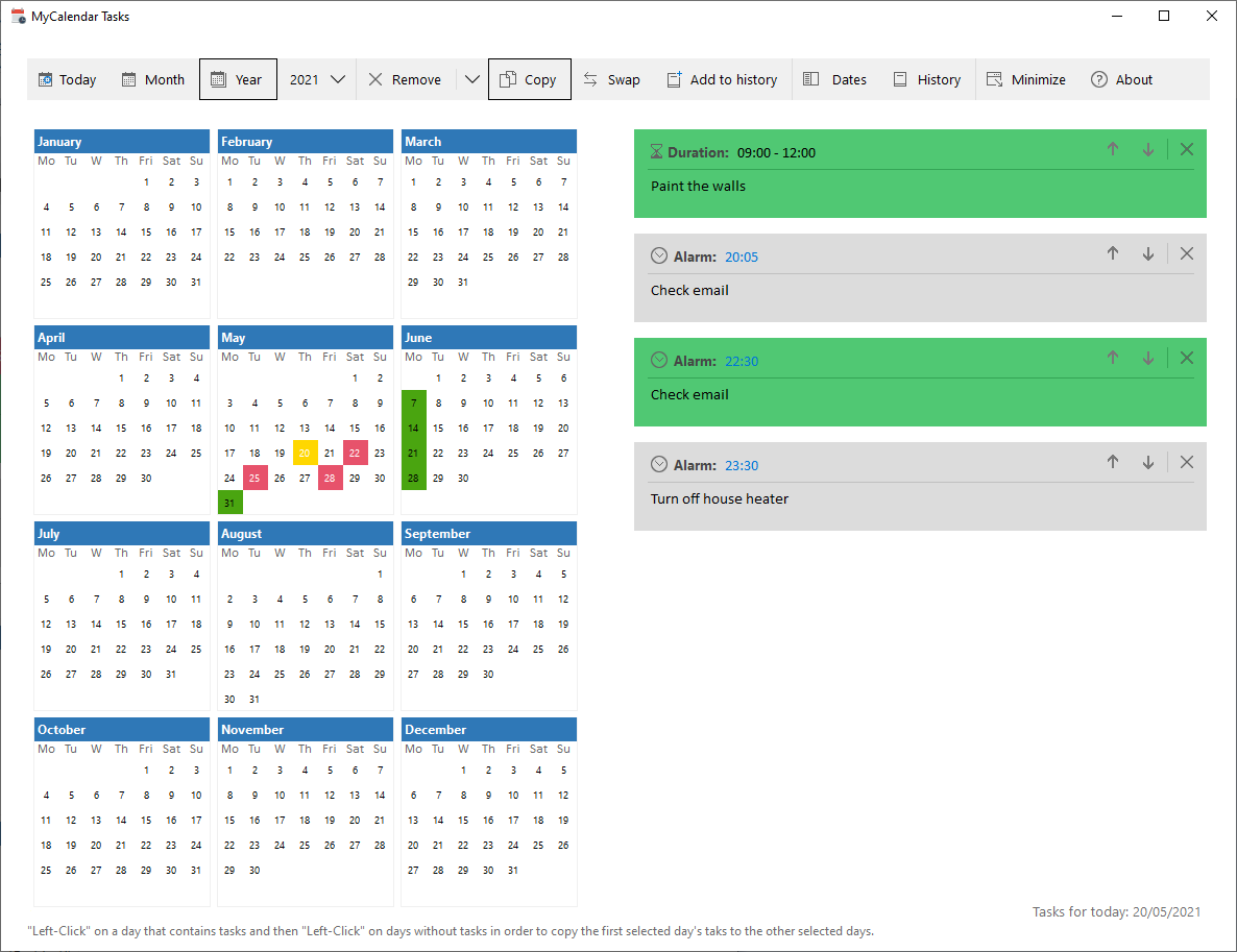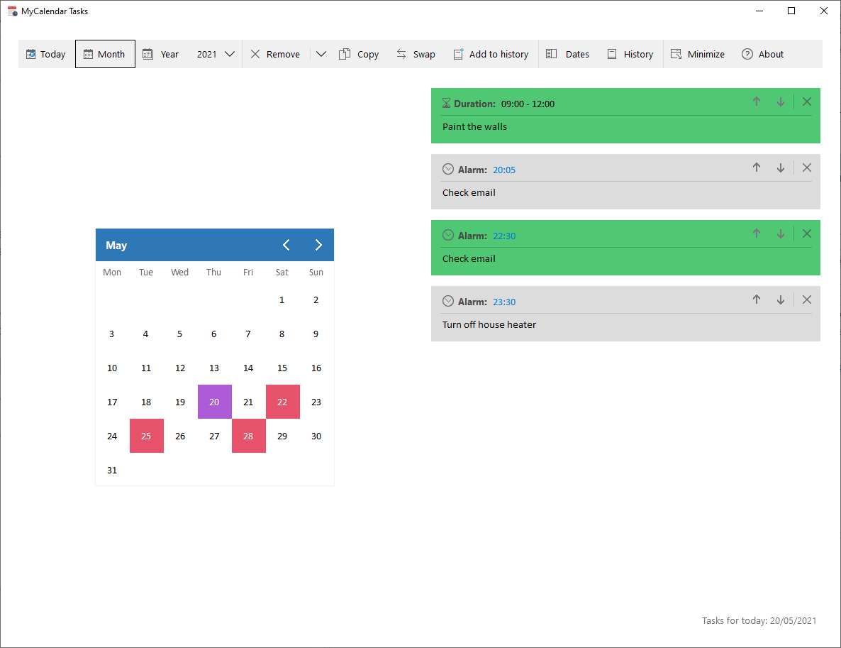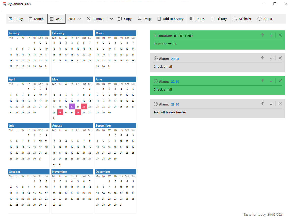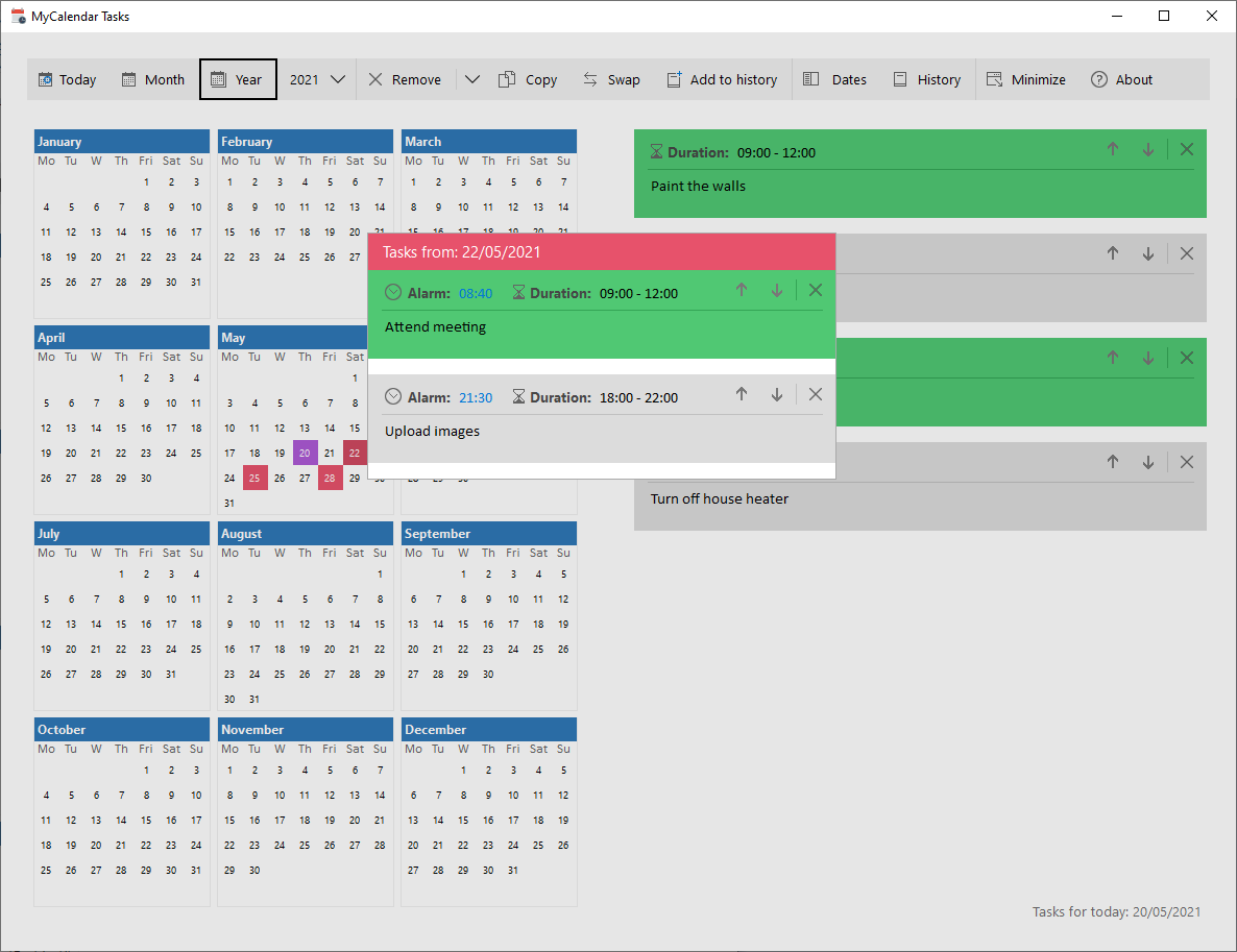 MyCalendar Tasks is a typical "Todo List" application but with dates. Assign tasks on days, setup your alarms, minimize the application to tray and wait for the alarm window to show right no time.