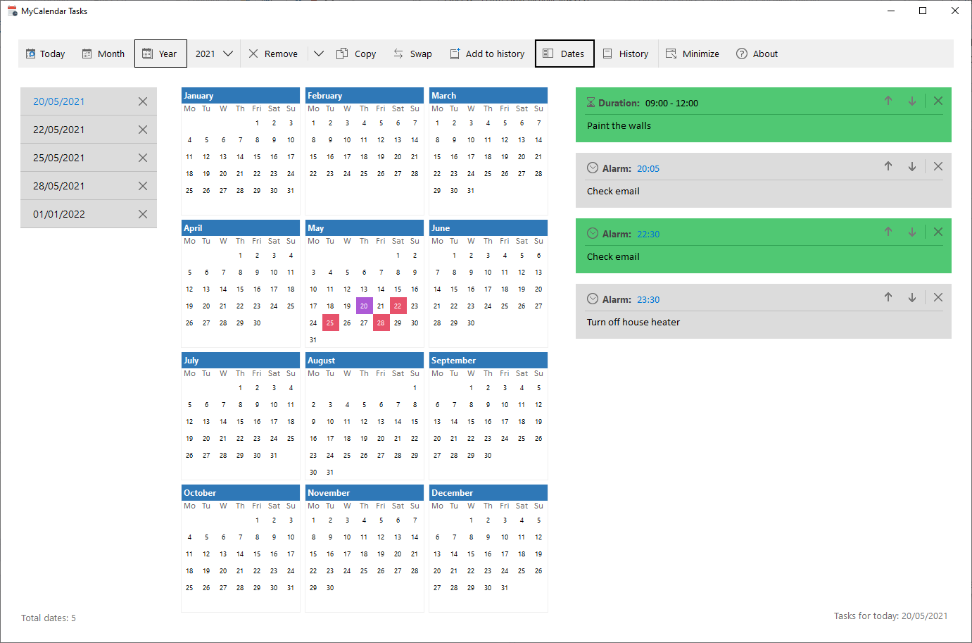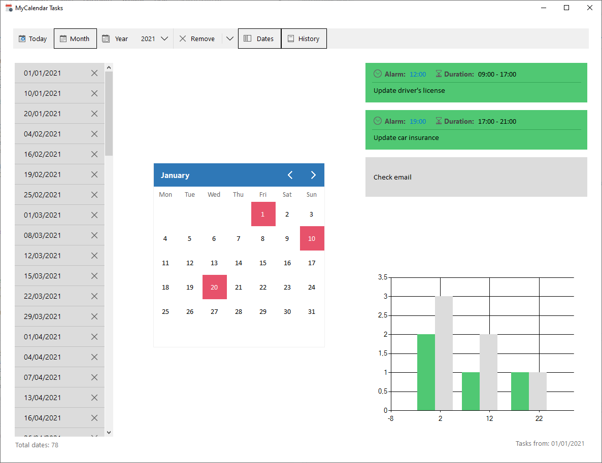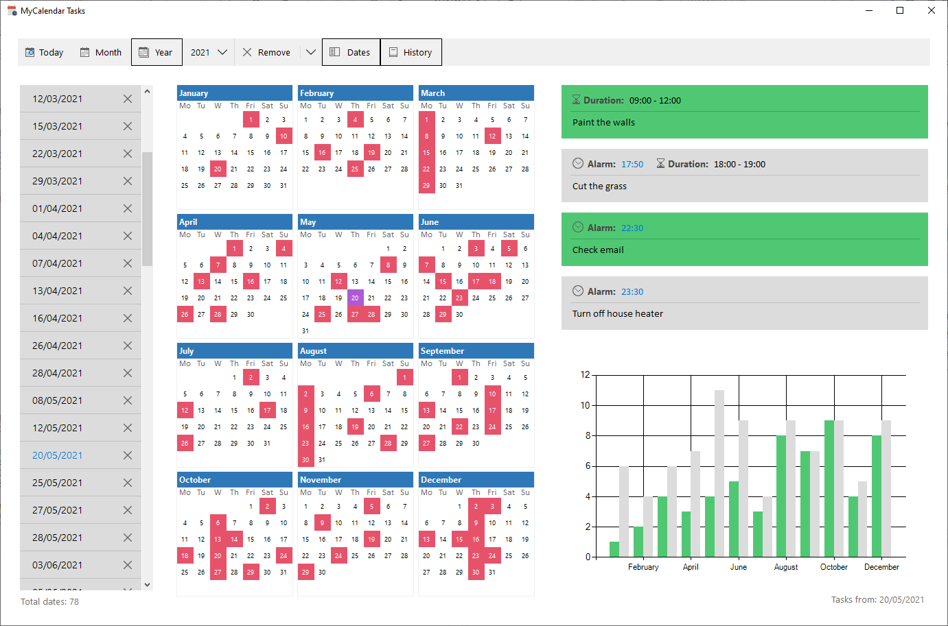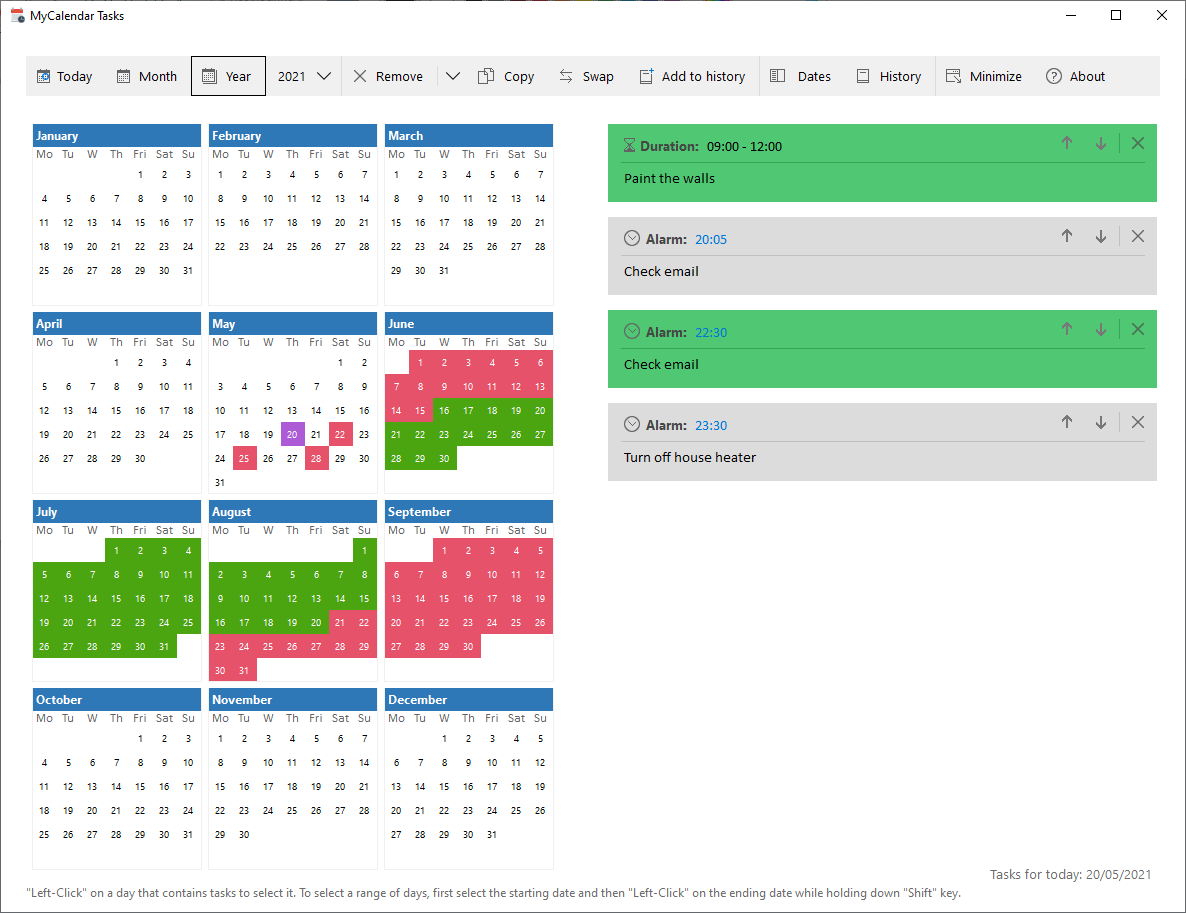 MyCalendar Tasks is a typical "Todo List" application but with dates. Assign tasks on days, setup your alarms, minimize the application to tray and wait for the alarm window to show right no time.