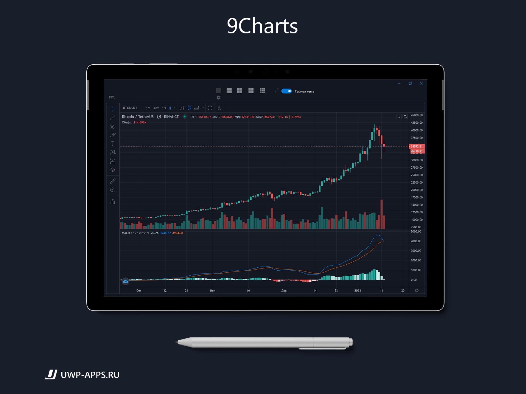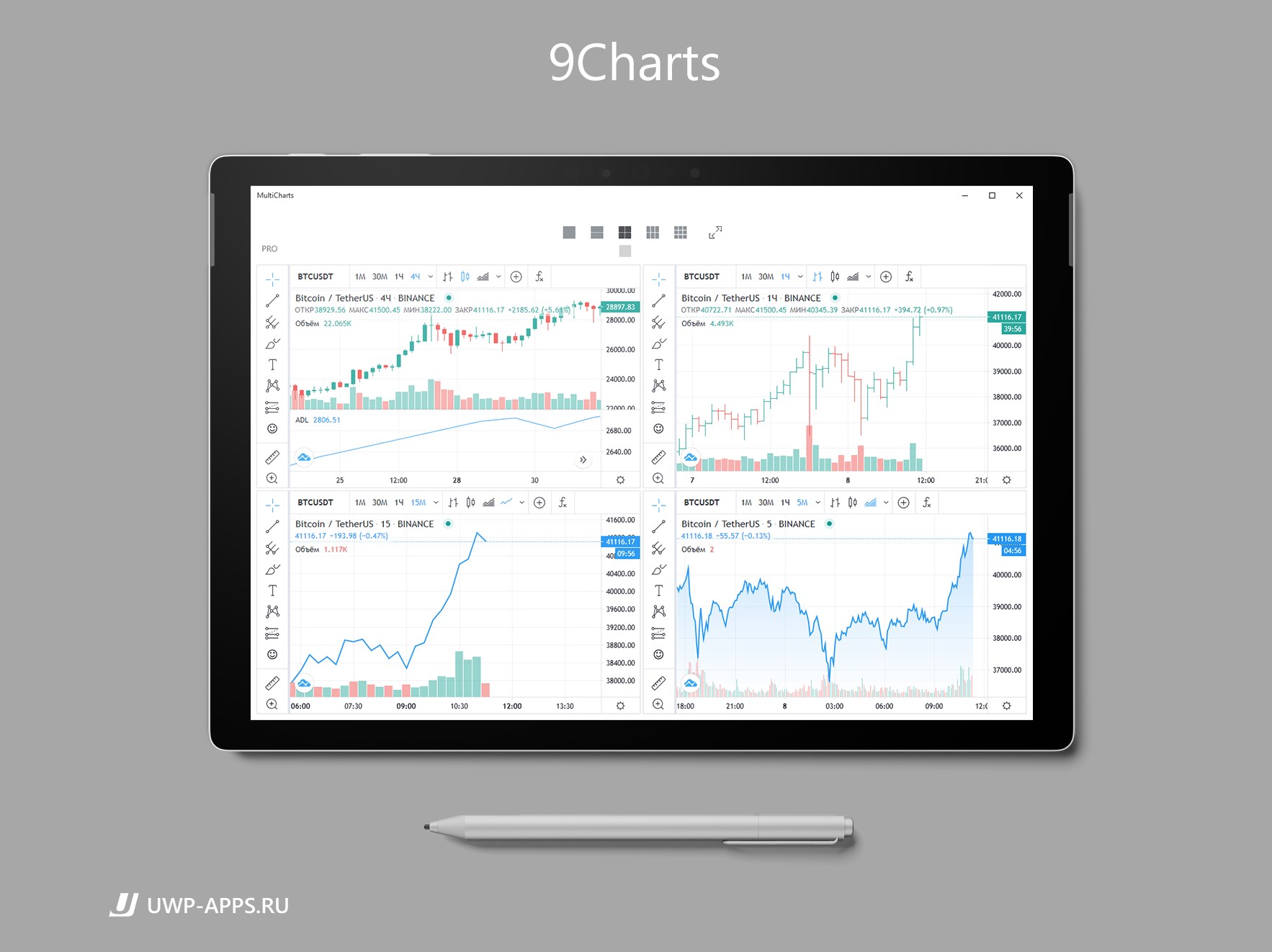 Do you want to monitor different timeframes of one trading pair or several trading pairs at once? With 9Charts, you can do it hassle-free with just a couple of button clicks! Track multiple charts in real time on one monitor and do not waste time switching between them. The application uses charts from the popular tradingview service.
