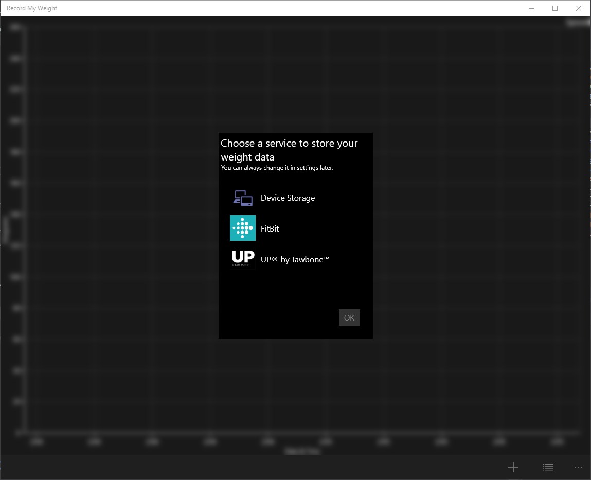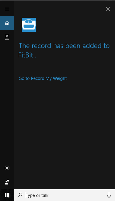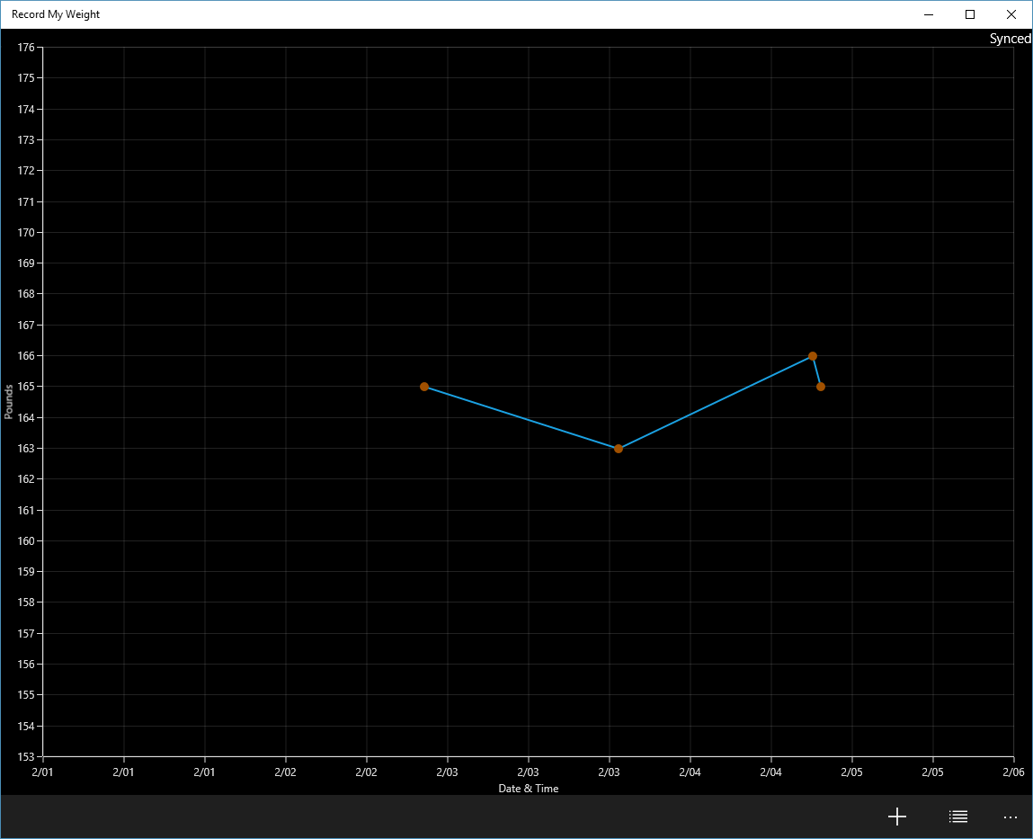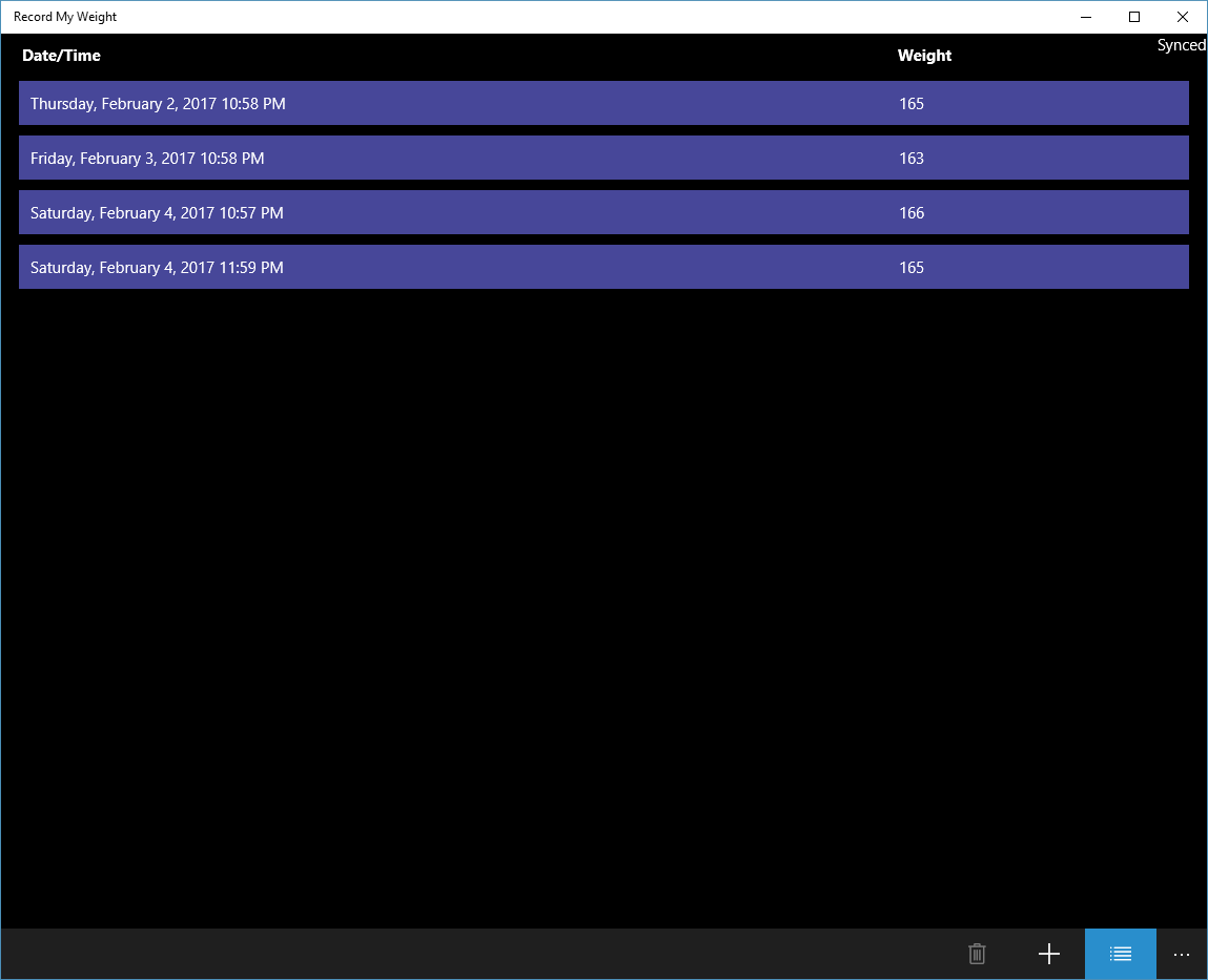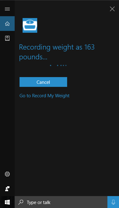 This app records users' weights through Cortana (primarily) when the user is on an non-internet-connected scale. When launched, the app will also show the most recent weight values in a simple plot and list with the ability to delete weights and add new ones manually.