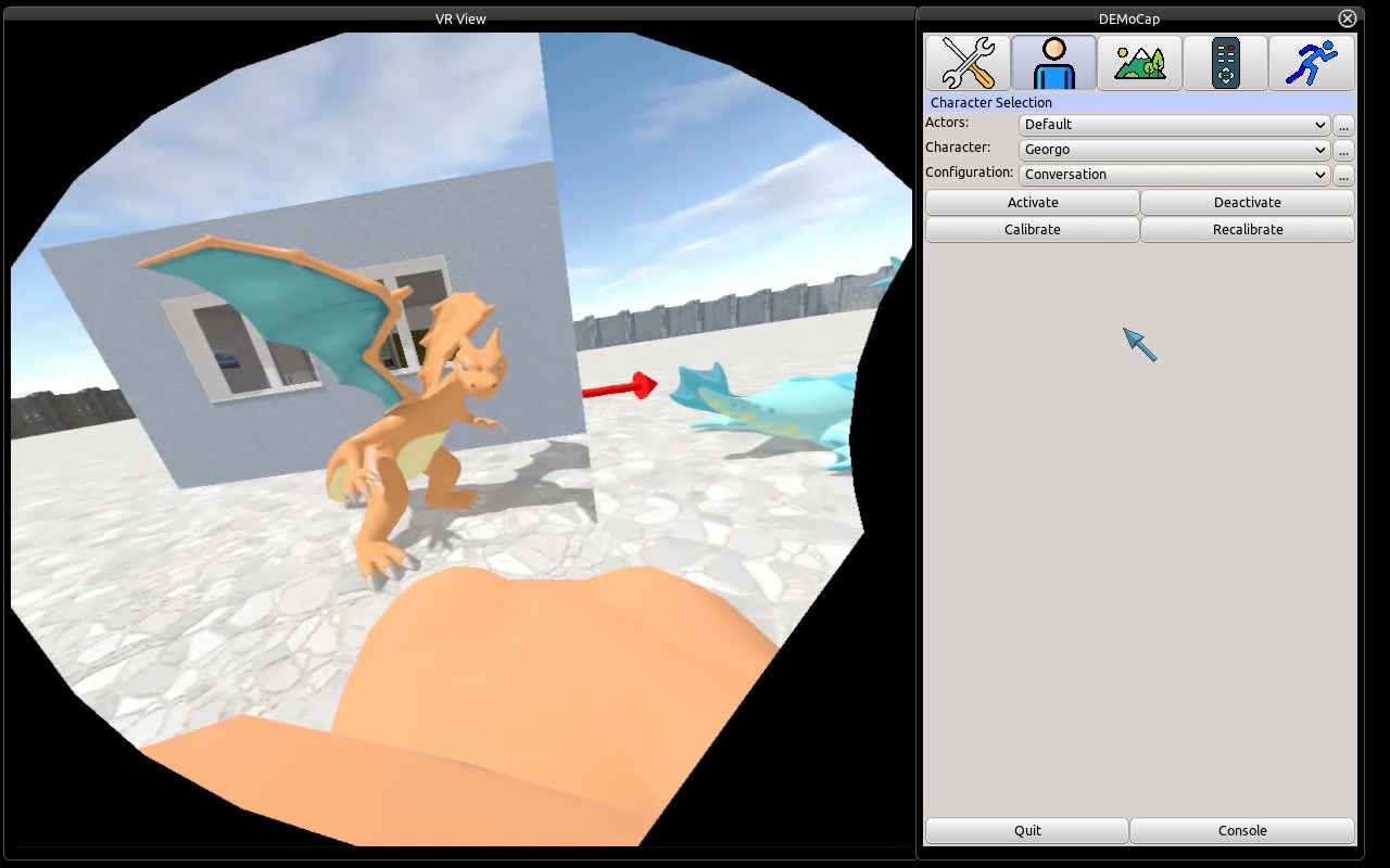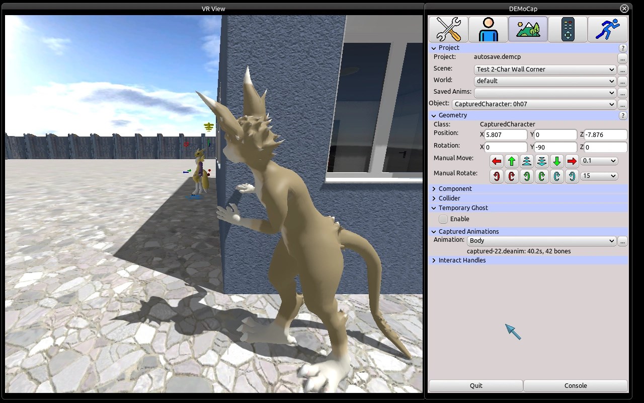 The DEMoCap Application allows to do Motion Capture using VR equipment. There are various advantages to this technique compared to other MoCap techniques: