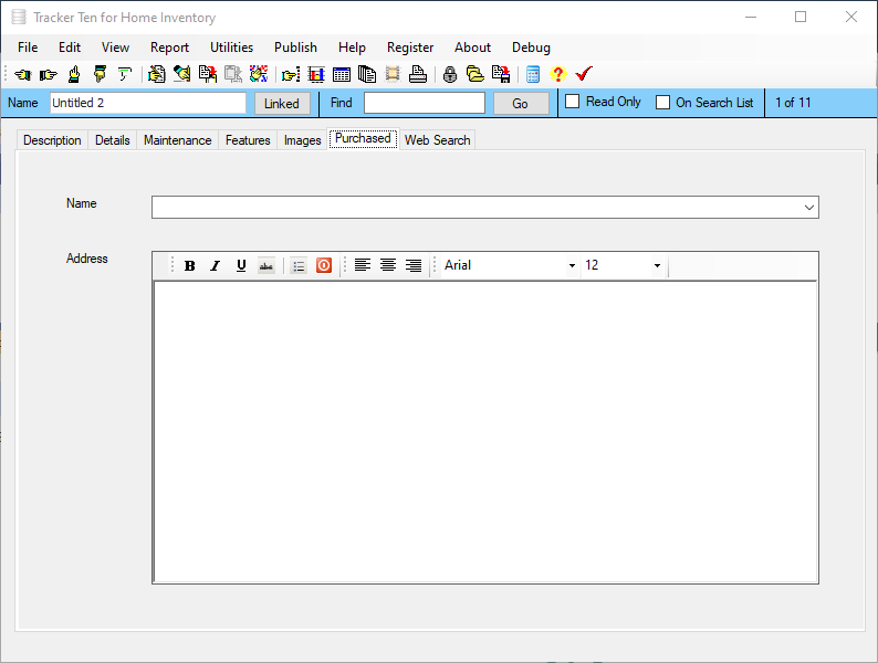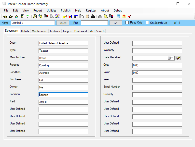 Tracker Ten for Home Inventory is a full-featured database system that tracks your household items, including art work, electronics, jewelry, furniture, collectibles and much more. You can use the software for tracking items for insurance, warranty and organizational purposes. You can also keep track of product manual PDF's and receipt scans in the image area. Tracker Ten for Home Inventory incorporates a powerful search engine, a versatile report writer, easy data entry, context sensitive help, full customization, data graphing, an album view, a spreadsheet view, multiple image support, and much more. Using the software you can easily generate full color reports with pictures of all of your valuables, great for insurance record keeping. The software is extremely easy to use.