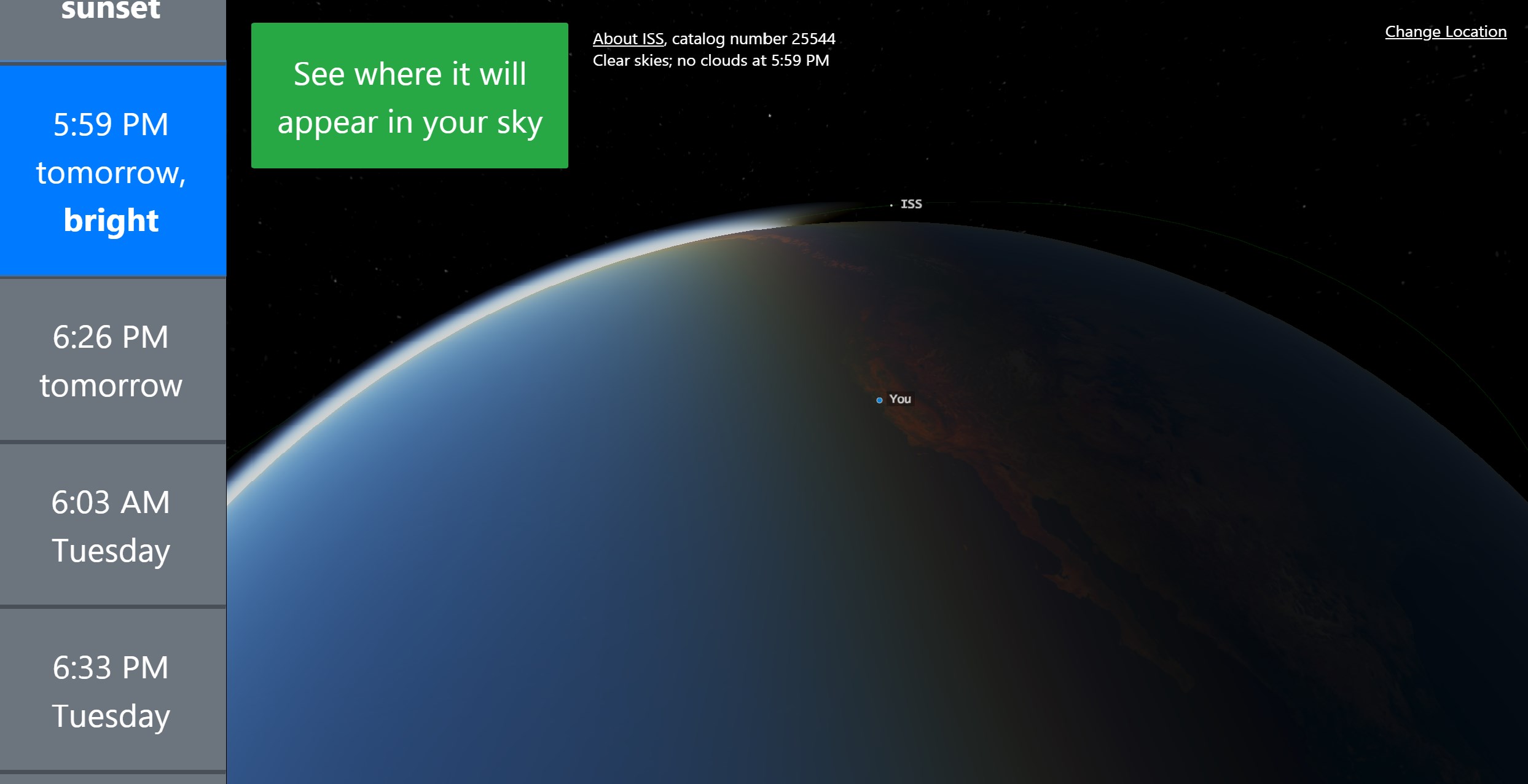 Satellites are visible in the night sky, like moving stars. You can see them just by looking up at the right time. See A Satellite Tonight shows you exactly when and where to look for them.
