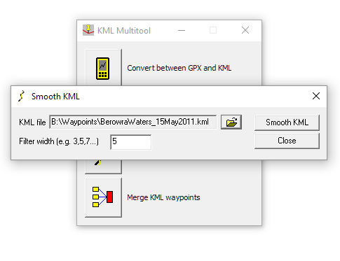 1.5: Added options to merge waypoints, tracklogs, or both. Fixed an issue with smoothing KML files where all coordinates in a tracklog are on the same line in the file.