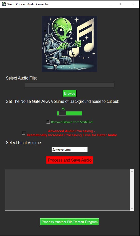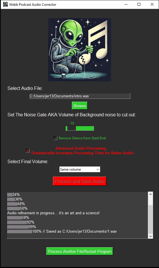 Noise Gate Adjustment: Reduce unwanted background noise with customizable noise gate settings. Whether it\'s a low hum or hiss, Webb Podcast Audio Corrector ensures your audio stays crisp and clear.Dynamic Range Compression: Balance volume across your recordings. Soften loud parts and amplify quiet sections, making your audio more consistent and engaging for listeners.Silence Removal: Automatically trim unwanted silence from the start and end of your recordings. Save time and keep your content focused and professional with this feature.Equalization (EQ): Fine-tune your audio with precision EQ settings. Whether boosting bass, enhancing mids, or brightening highs, adjust your sound to meet your needs.Volume Normalization: Adjust your audio\'s volume to your desired level. Keep the original volume or make your audio up to 100% louder, ensuring your recordings stand out.Real-Time Preview: Preview a 10-second snippet of your processed audio to ensure your settings are perfect before applying them to the entire file.Intuitive Mostly Automatic User Interface: Navigate a clean, modern interface designed for ease of use. Whether you\’re a pro or beginner, Webb Podcast Audio Corrector makes audio enhancement simple.Now with spectral subtraction and an easy-to-understand user dialogue interface!Chunked Volume Leveling: Makes sure the whole track is happening at the same volume, adjusting low volume audio to match high volume audio