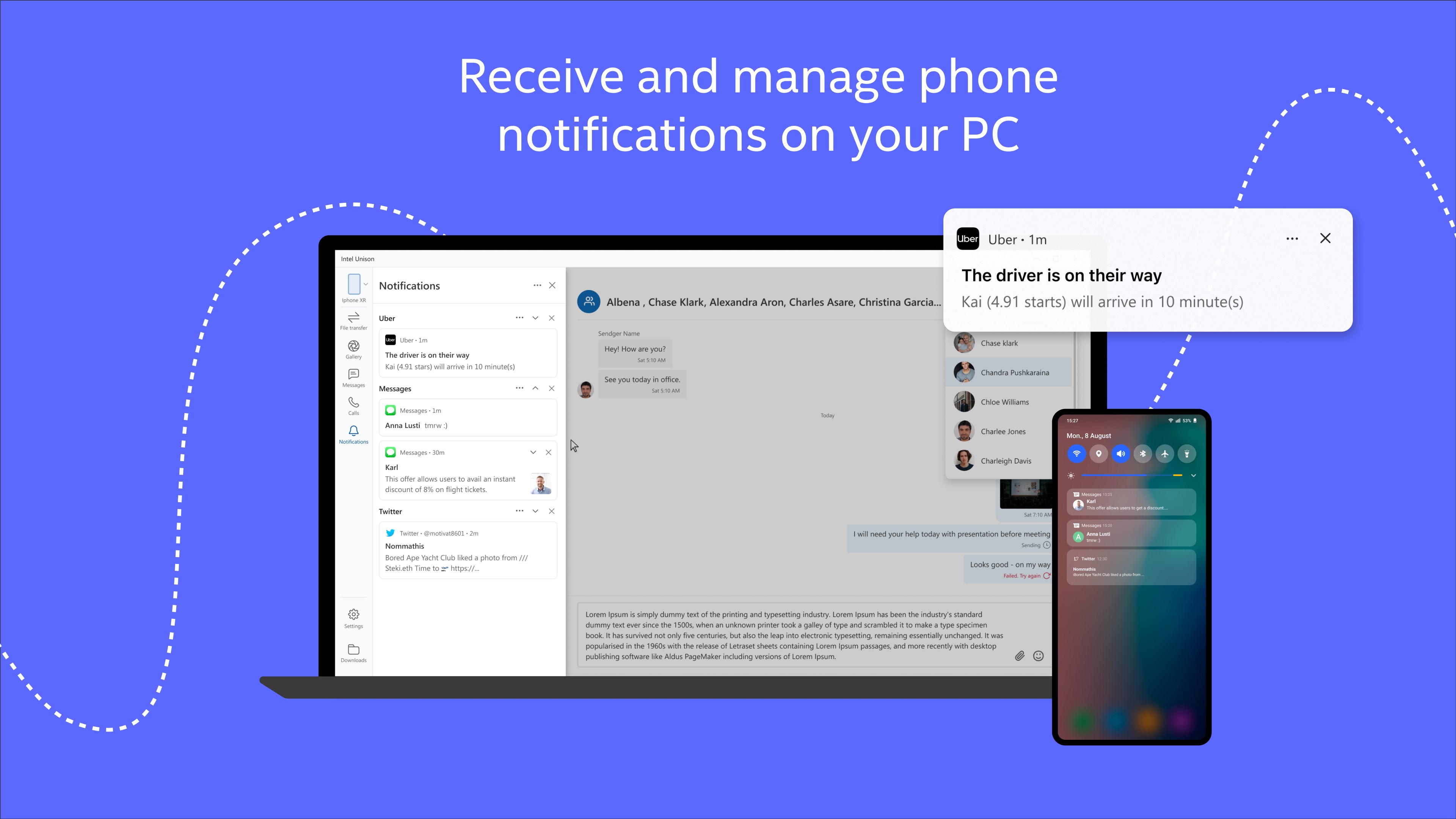 • One-time quick pairing • Cross-OS functionality (Windows, Android, iOS) • Send, receive, and reply to SMS and iMessages • Reply to notifications • Incoming and outgoing calls directly from your PC