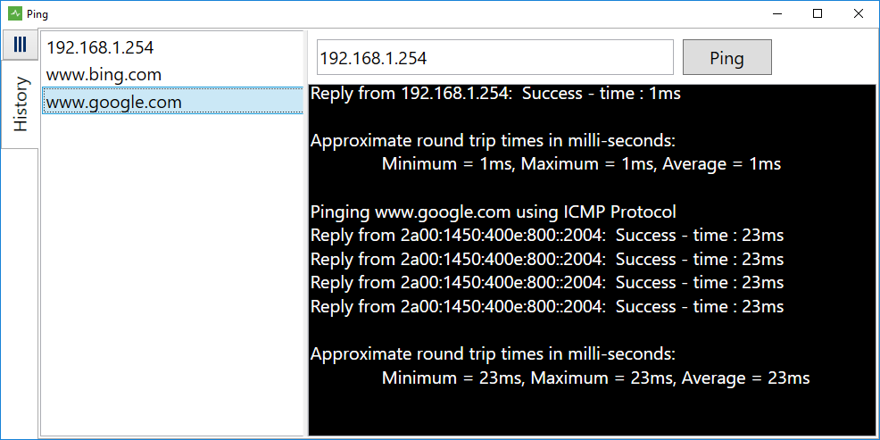 Stores history for the previous 10 ping requests.Resolves DNS names to IP addressesDouble click a history item to ping it.Clean and simple to use.Low memory usage.No ads.