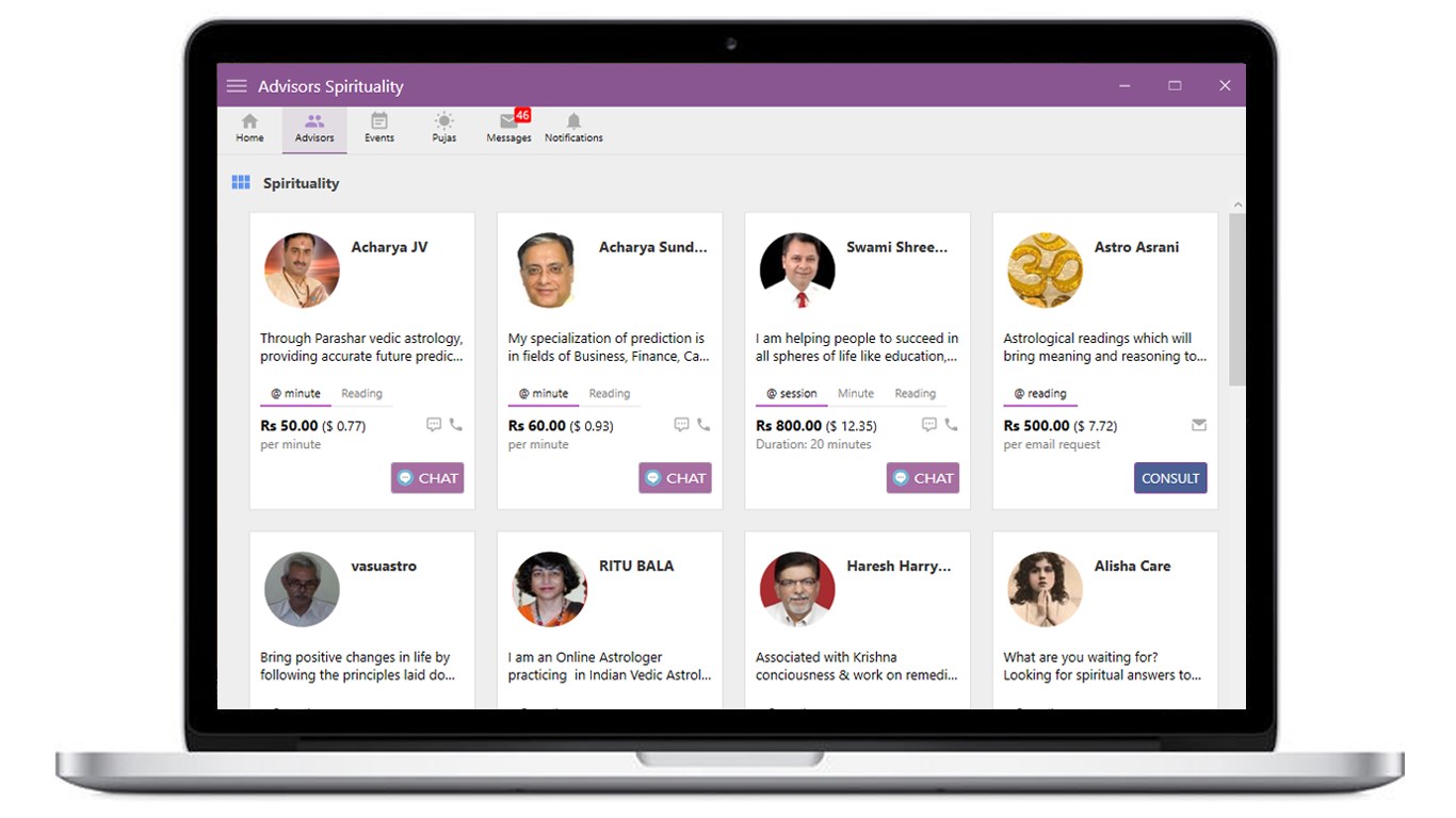 Our purpose is to give seamless connectivity between the Advisor and Member using various modes of communication. Customers can take advice via Chat, Phone or email readings.