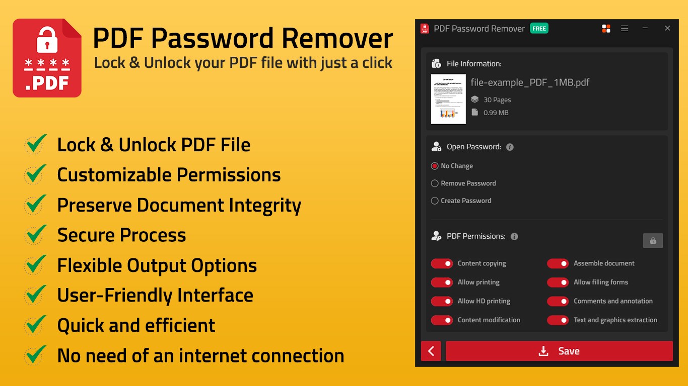 Efficient Password Removal: Remove both user and owner passwords from PDF files swiftly, enabling you to access your documents without any hassle.Customizable Permissions: You may restrict what can be done with your documents, such printing, copying, and editing, so they are only used for the purposes intended.Intuitive Interface: Designed for user-friendliness, PDF Password Remover offers a simple and intuitive interface, making it accessible to users of all skill levels.Preserve Document Integrity: Remove passwords without compromising the quality or integrity of your PDF files, ensuring that your documents remain intact.Secure Process: Rest assured that your sensitive information stays secure during the password removal process, with robust encryption protocols safeguarding your data.Wide Compatibility: Compatible with a wide range of PDF versions, ensuring compatibility with most password-protected documents.Flexible Output Options: Choose your preferred output options, whether you want to save the unlocked PDFs to a specific folder or overwrite the original files.