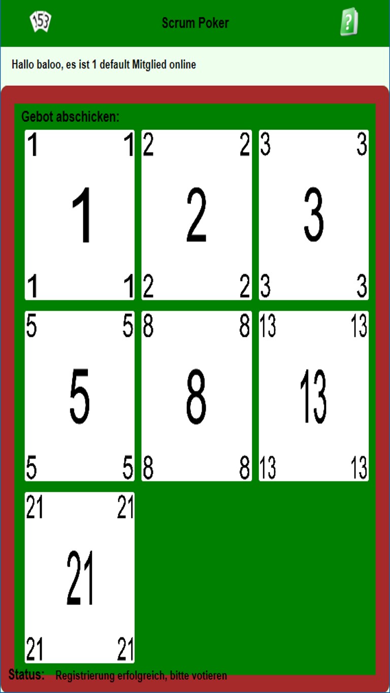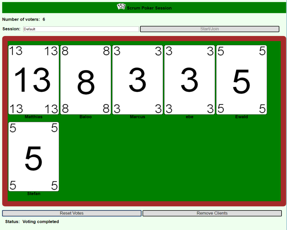 First a session ID must be defined and started. With this ID all members must connect to this session. Then the backlog items can be groomed one after the other. After one item is groomed the scrum master resets all votings and the next voting can be performed. After the session the members could just leave the app or the scrummaster removes all members actively.