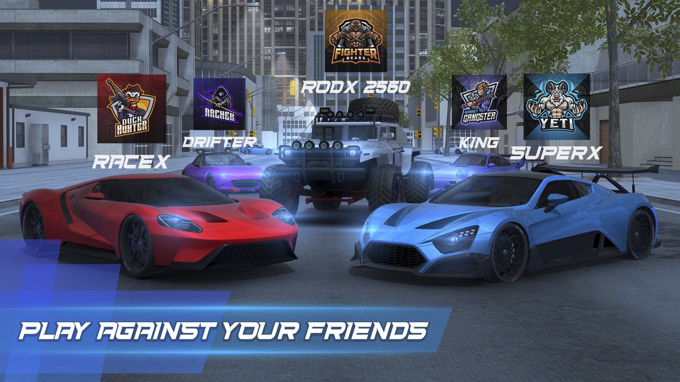 Race real racing cars with your friends in big 3d city and mega ramp parkours.