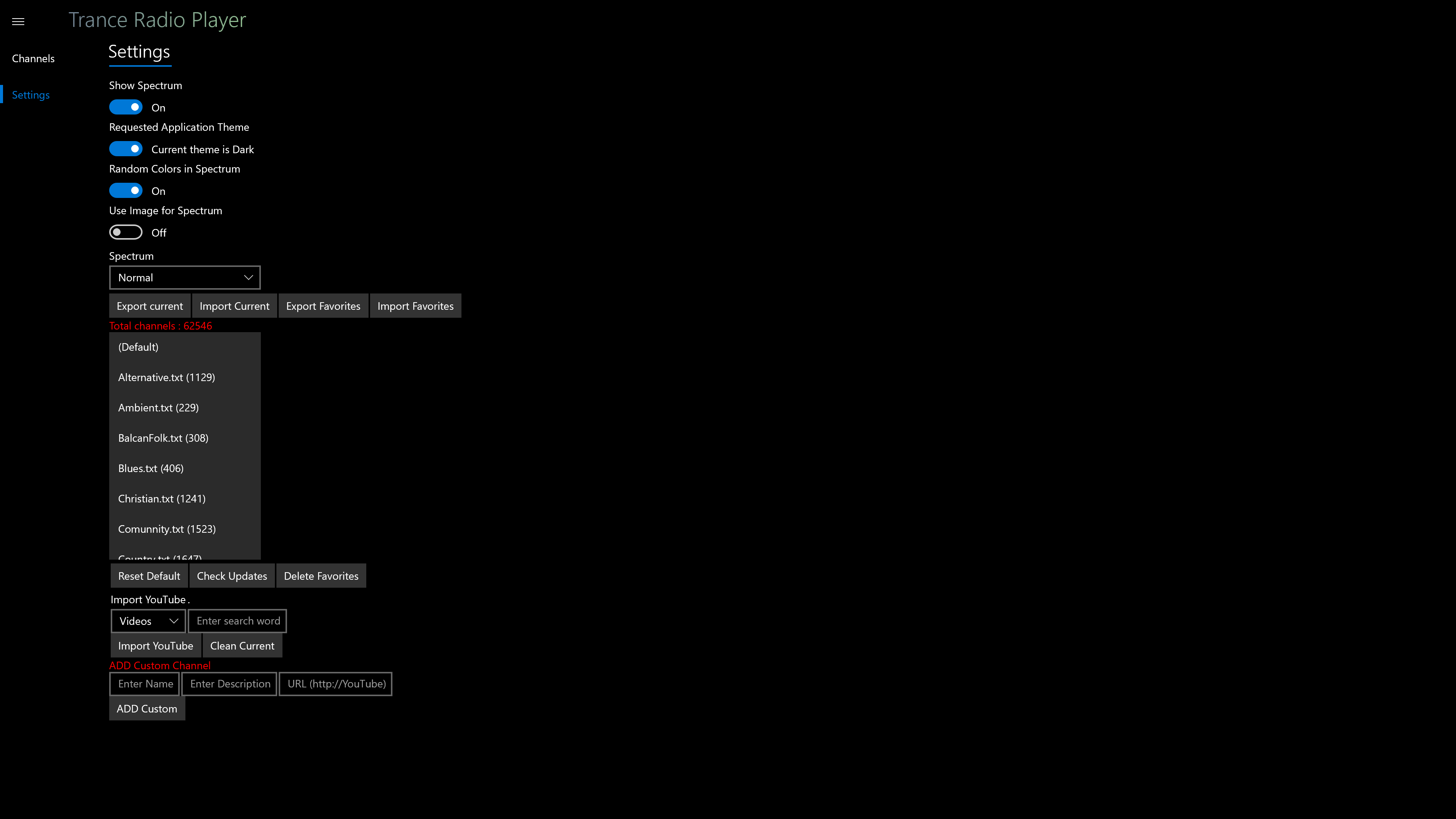 Added Custom channel under settings to merge with current station list. (Supports also YouTube).
