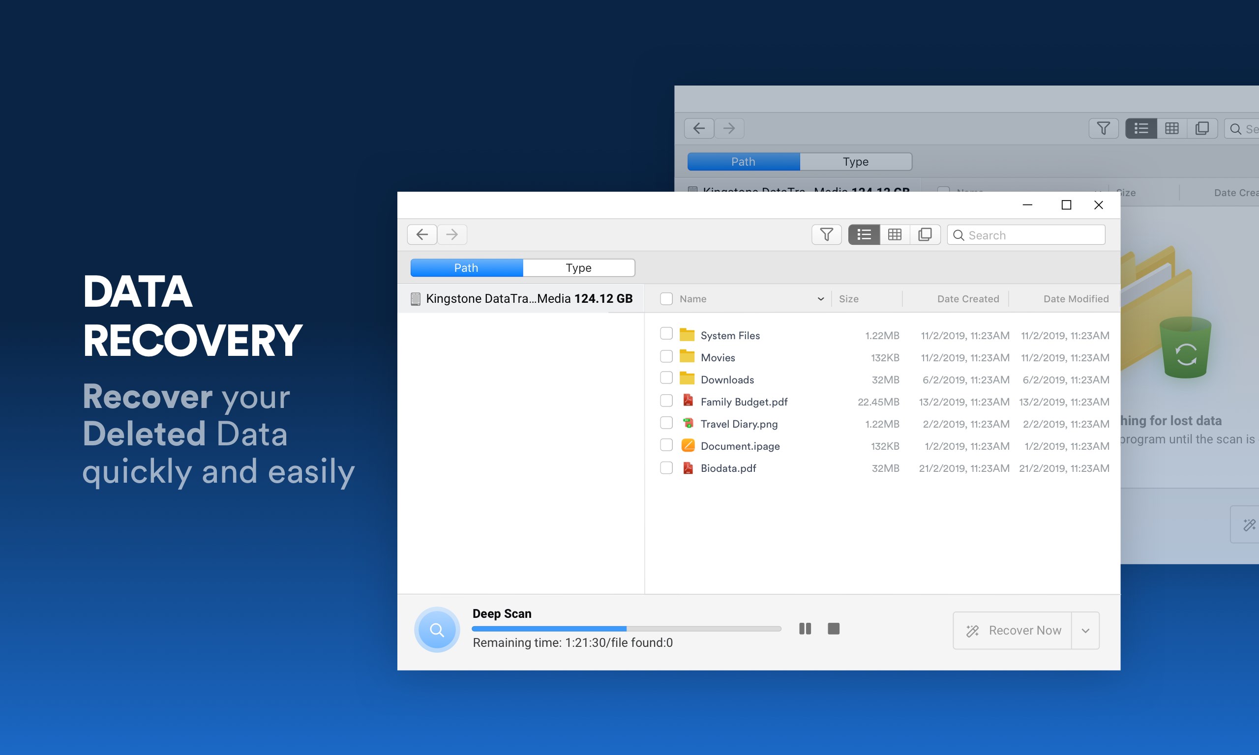- Easily recovers files, folders, documents, photos, videos, audio, etc.
