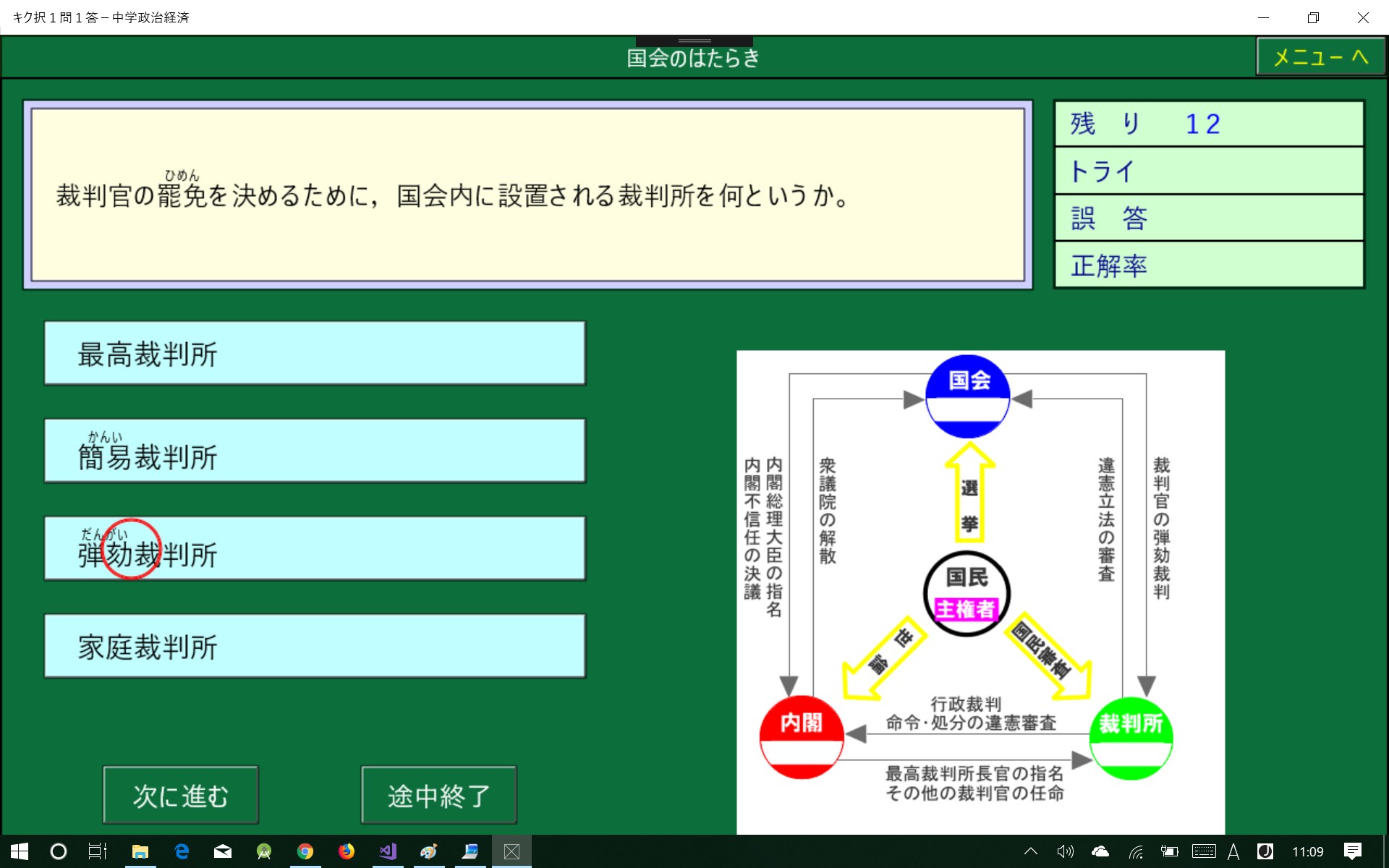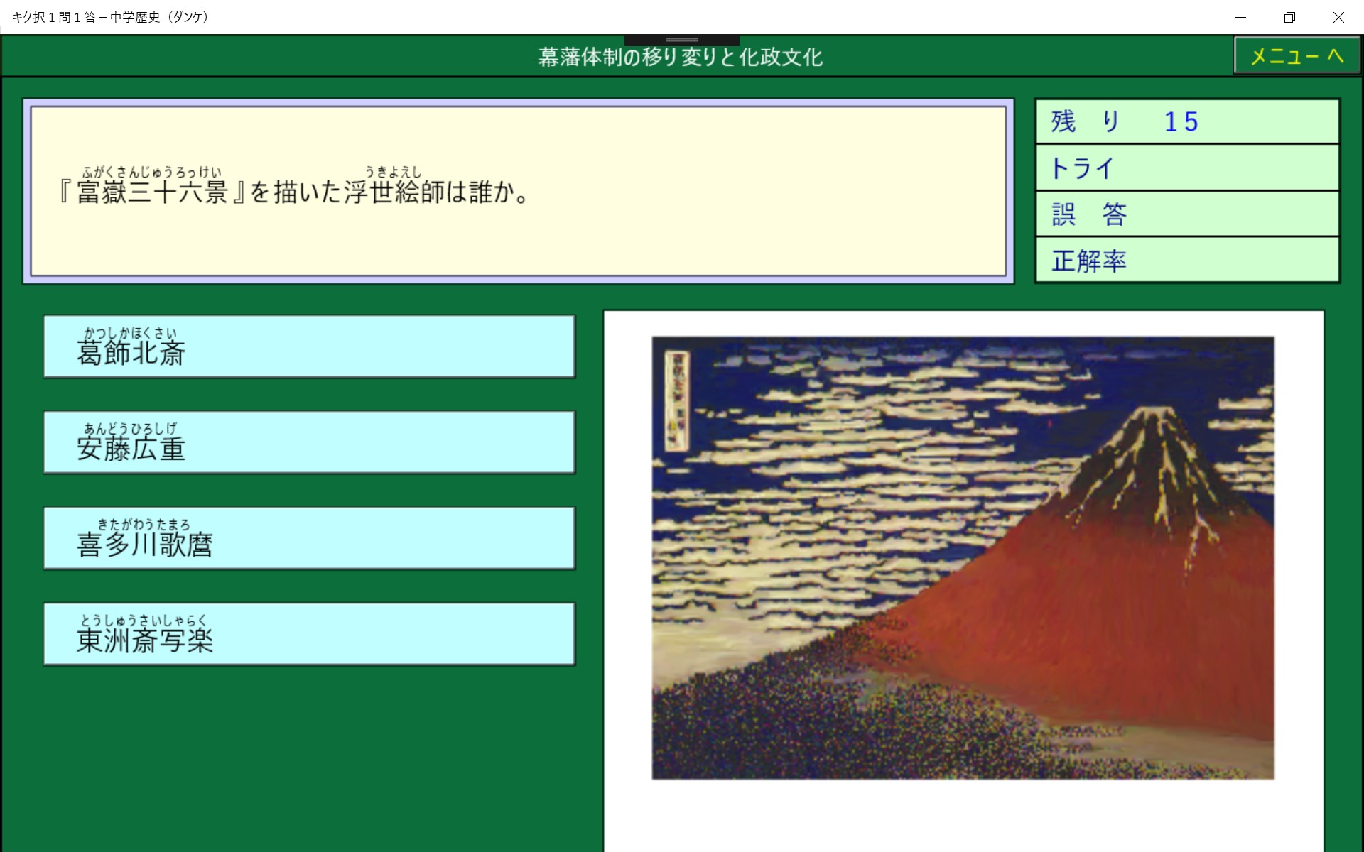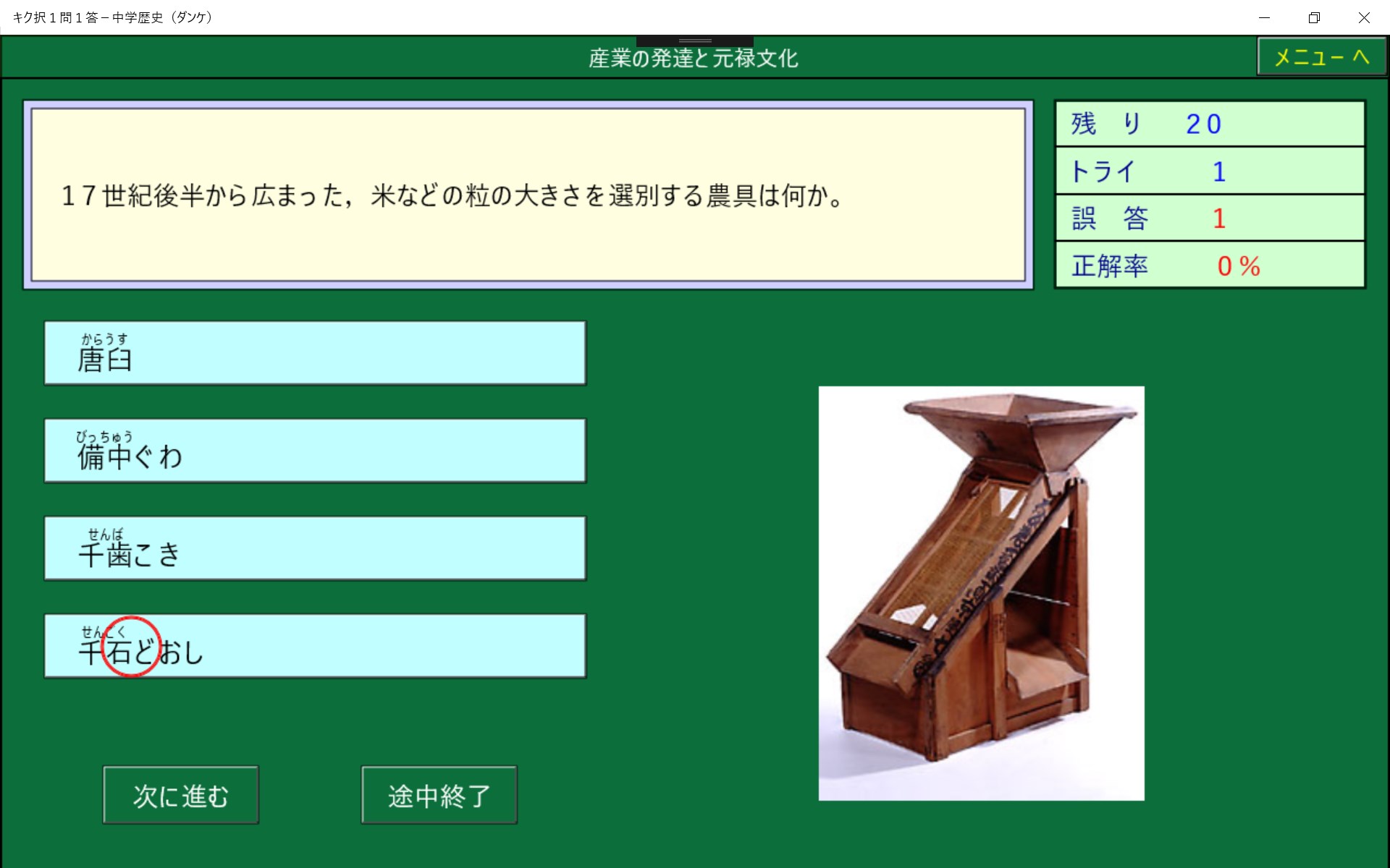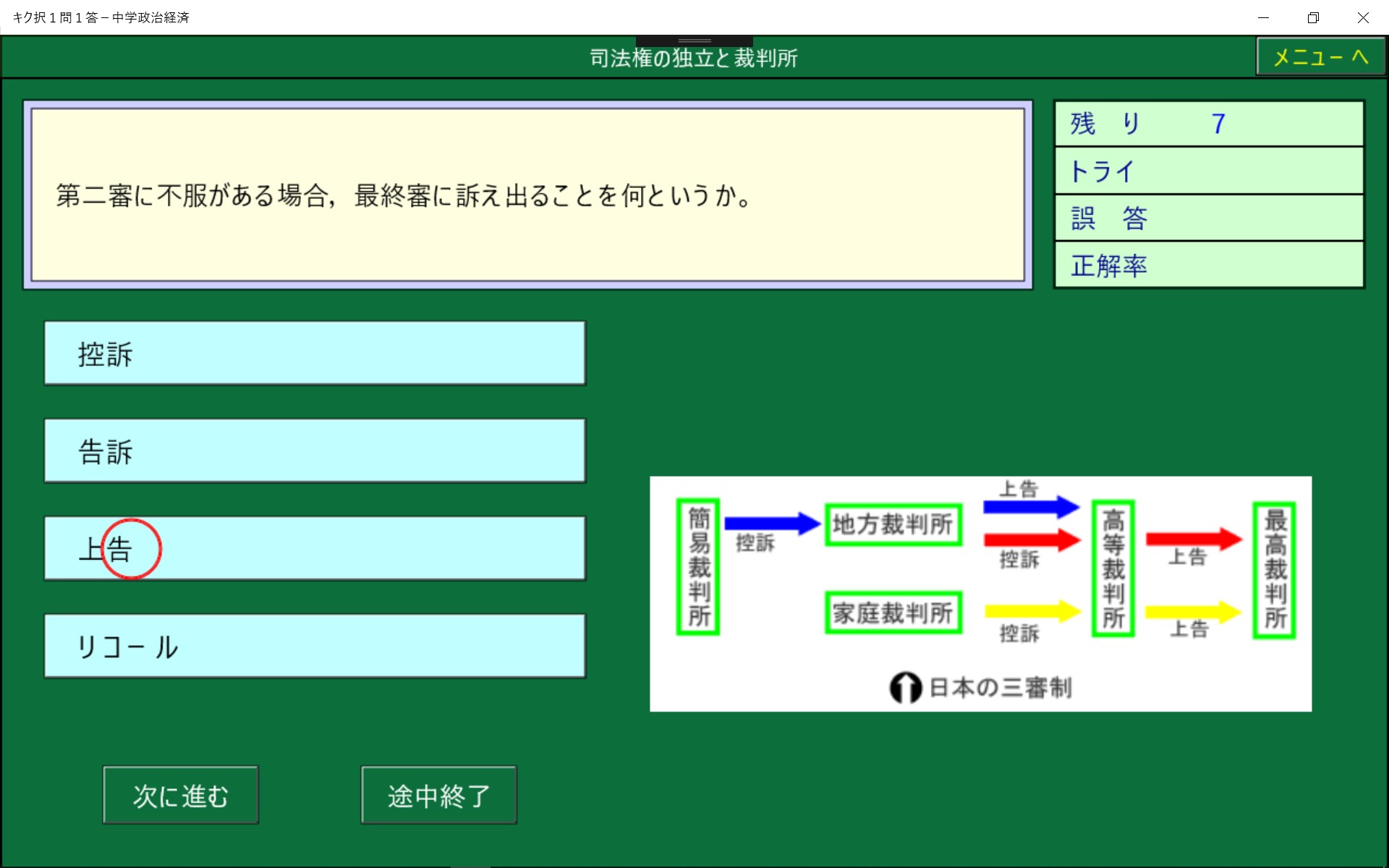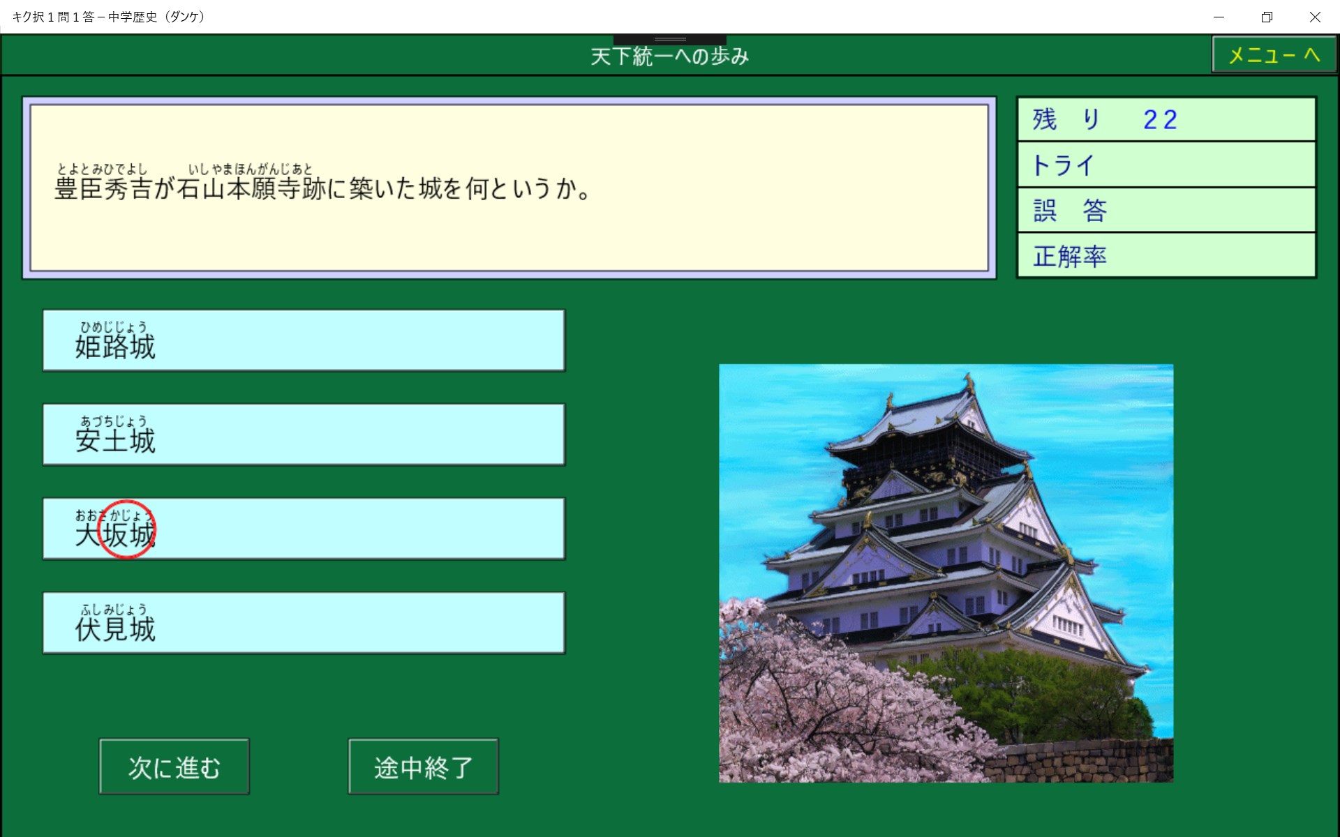 中学社会で学習する地理・歴史・公民を1問1答形式にしました。高校入試の総整理に最適です。正解削除機能により,まちがった問題は繰りかえし出題されます。また,1問ごとに正誤が記録されるので誤答した問題のみを実行することができ,効率よく学習でき時間の短縮になります。