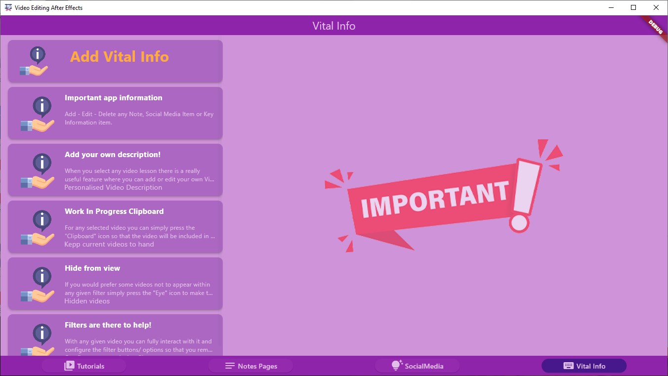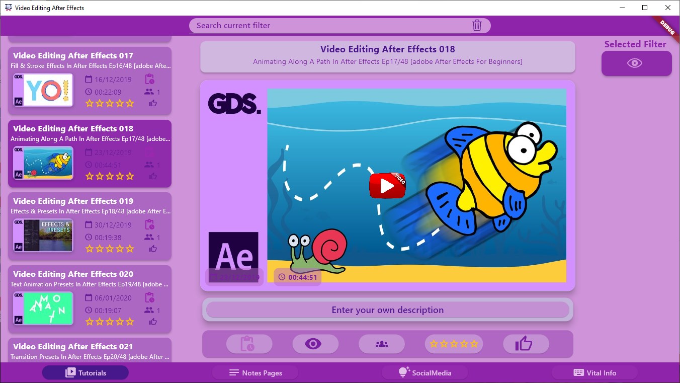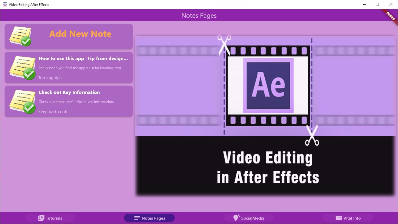 Over 270 Video Tutorials on After Effects video editing software. From beginners to experts there is something for all.Lessons range from pure beginners topics to more advanced projectsAdd currently used videos to the Clipboard for immediate access to work in progress filtered videosFully Customise and Maintain your own set of user notes within the self contained moduleFully Customise and maintain your own \'one touch\' Social Media Links to your favourite sites or user groups.Keep a customised set of \'Key Information\' details in the dedicated module so tou keep track of any vital info!All modules are there to help your learning experience all without the need to leave the app!Everything you need to learn as quickly as possible is included within the app