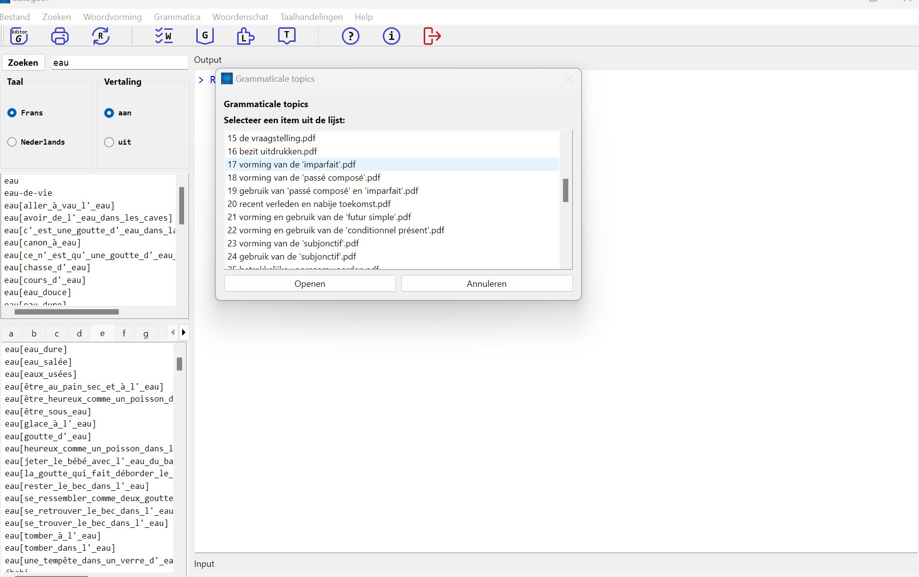 database of French example sentences / chunks with Dutch translation ; database can be used as a dictionary or a concordancer [level : intermediate / advanced]An overview of the main language acts for levels A1 - A2 (CEFR). This overview contains 21 chapters.A well-organized basic grammar of French for levels A1 - A2 (CEFR). This grammar includes 47 chapters.An overview of the main vocabulary that language learners at levels A1 - A2 (CEFR) should master. [approximately 21 chapters]