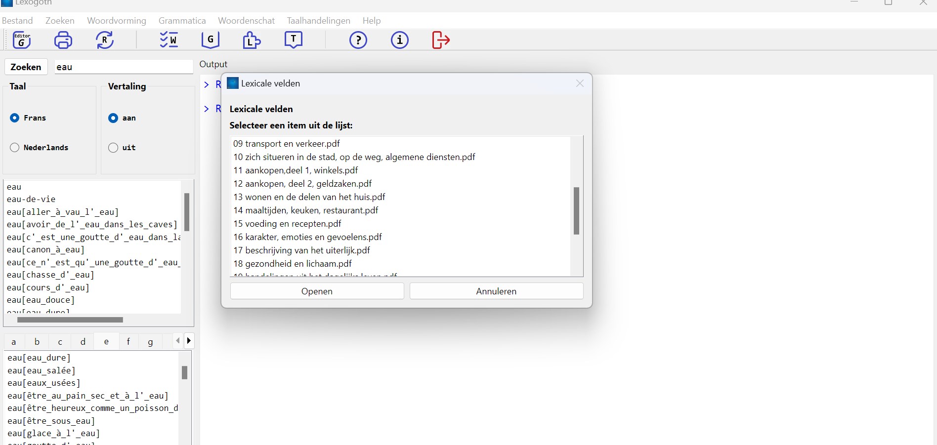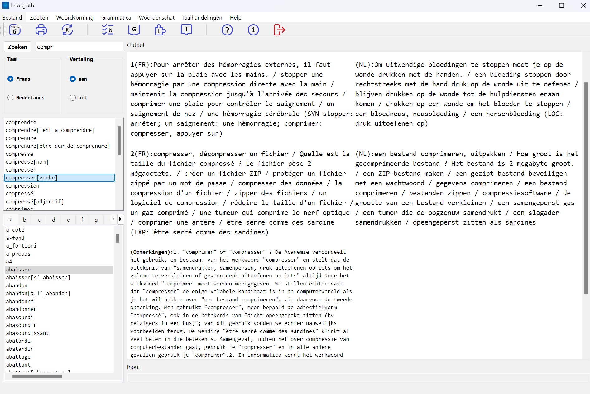 * The program Lexogoth is a database with about 30 000 chunks that illustrate the use of French words/structures in a clear way so that foreign language learners can use or learn them quickly and efficiently. All sentences or chunks were provided with a full Dutch translation and, where necessary, the program provides explanations for specific difficulties of some French words and structures.