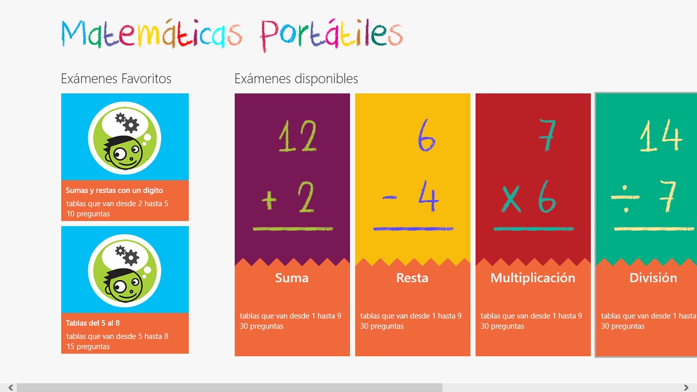 Matemáticas Portátiles es un software educativo que auxilia a los niños para el aprendizaje de las operaciones básicas de las matemáticas; como sumas, restas, multiplicaciones y divisiones. Dentro de ella podrá practicar y medir sus capacidades en cuestión del tiempo para resolverlas mentalmente. ¿Qué tan rápido puedes terminar un examen?