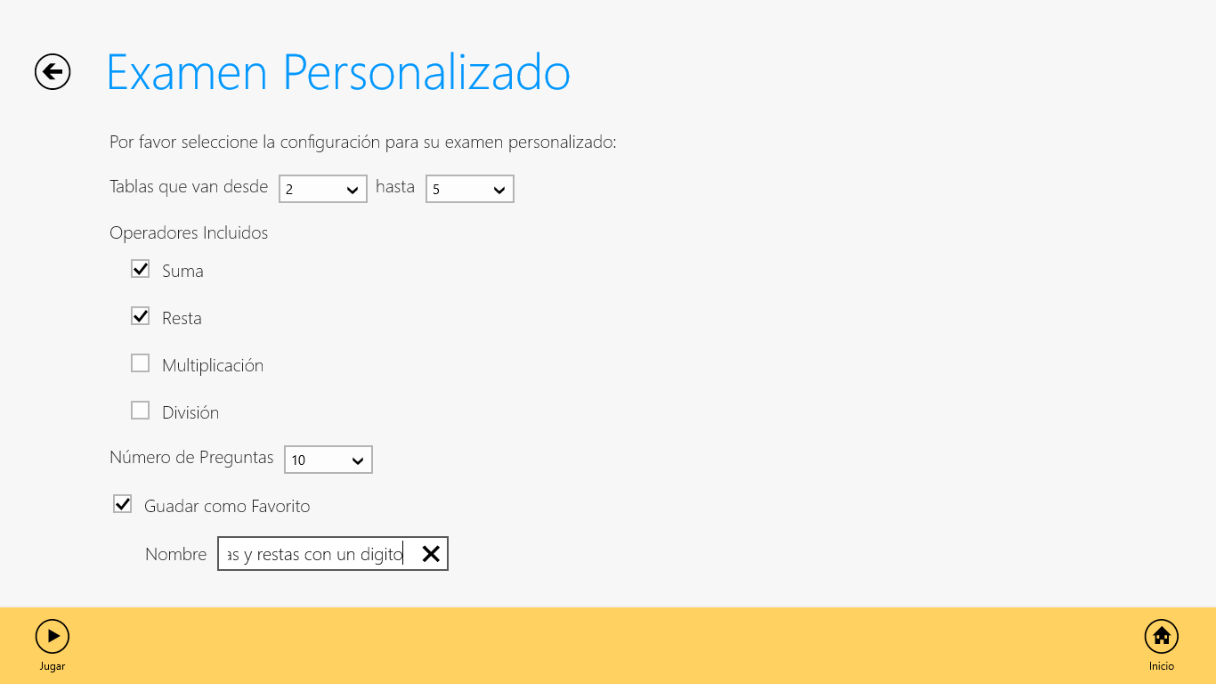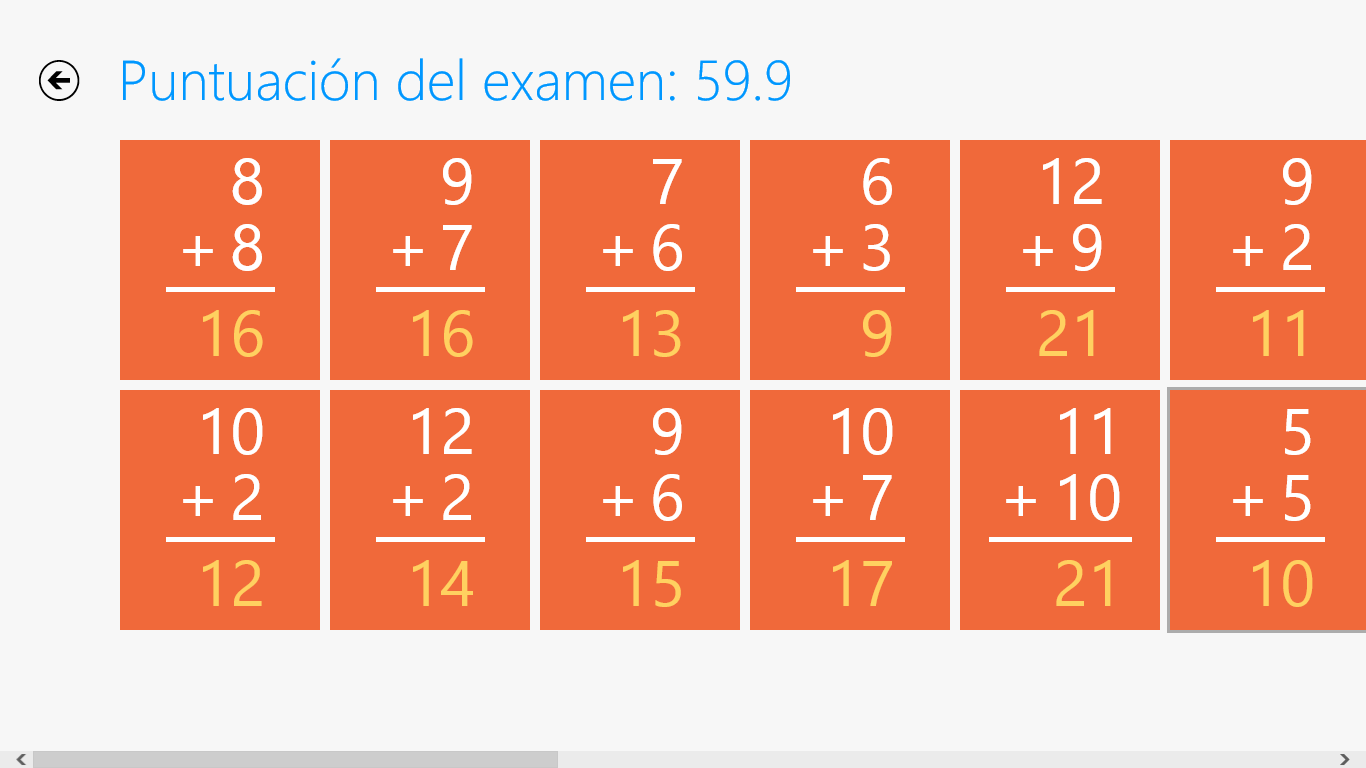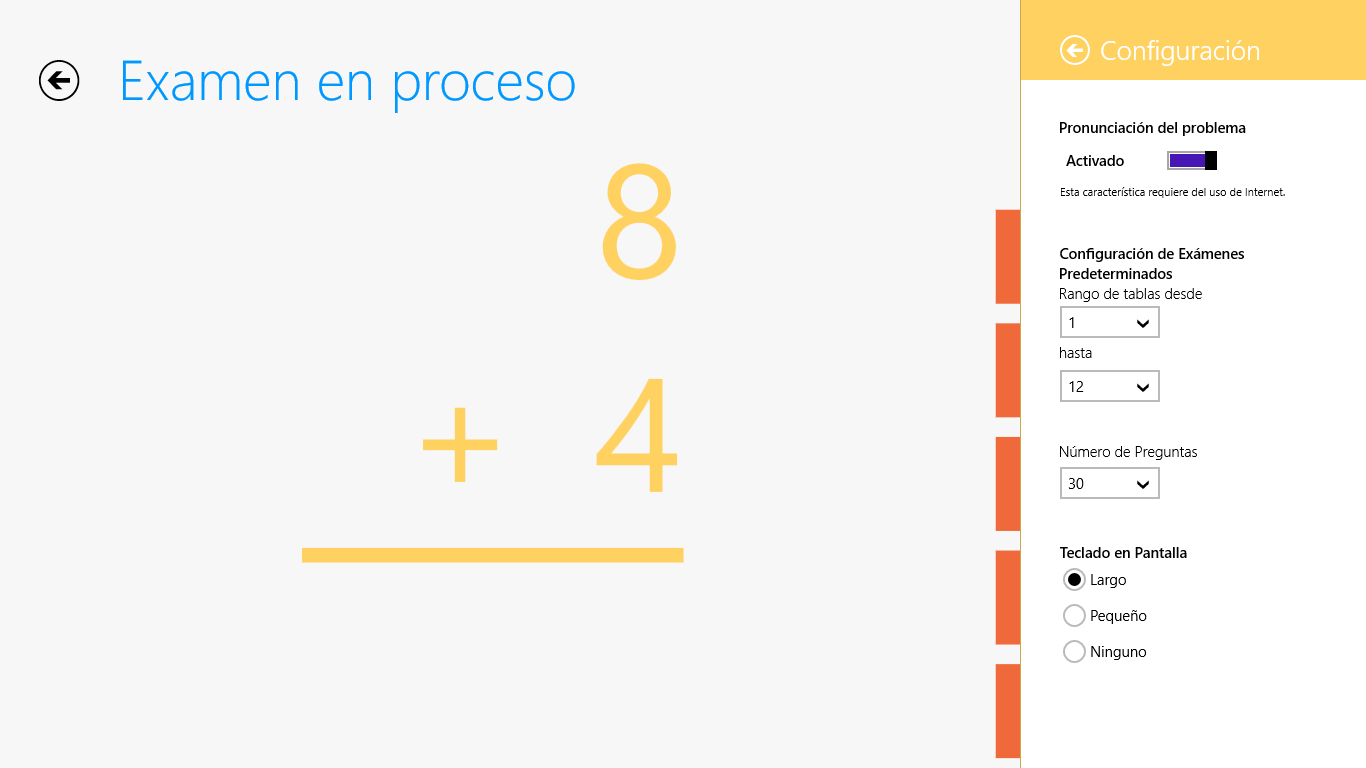 Cubre los aspectos básicos con exámenes predefinidos o crear el suyo propio.Los exámenes pueden incluir la suma, resta, multiplicación y división de las tablas matemáticas del 1 a 12.Los operaciones pueden ser expresadas con vozCompartir los resultados de tu examen