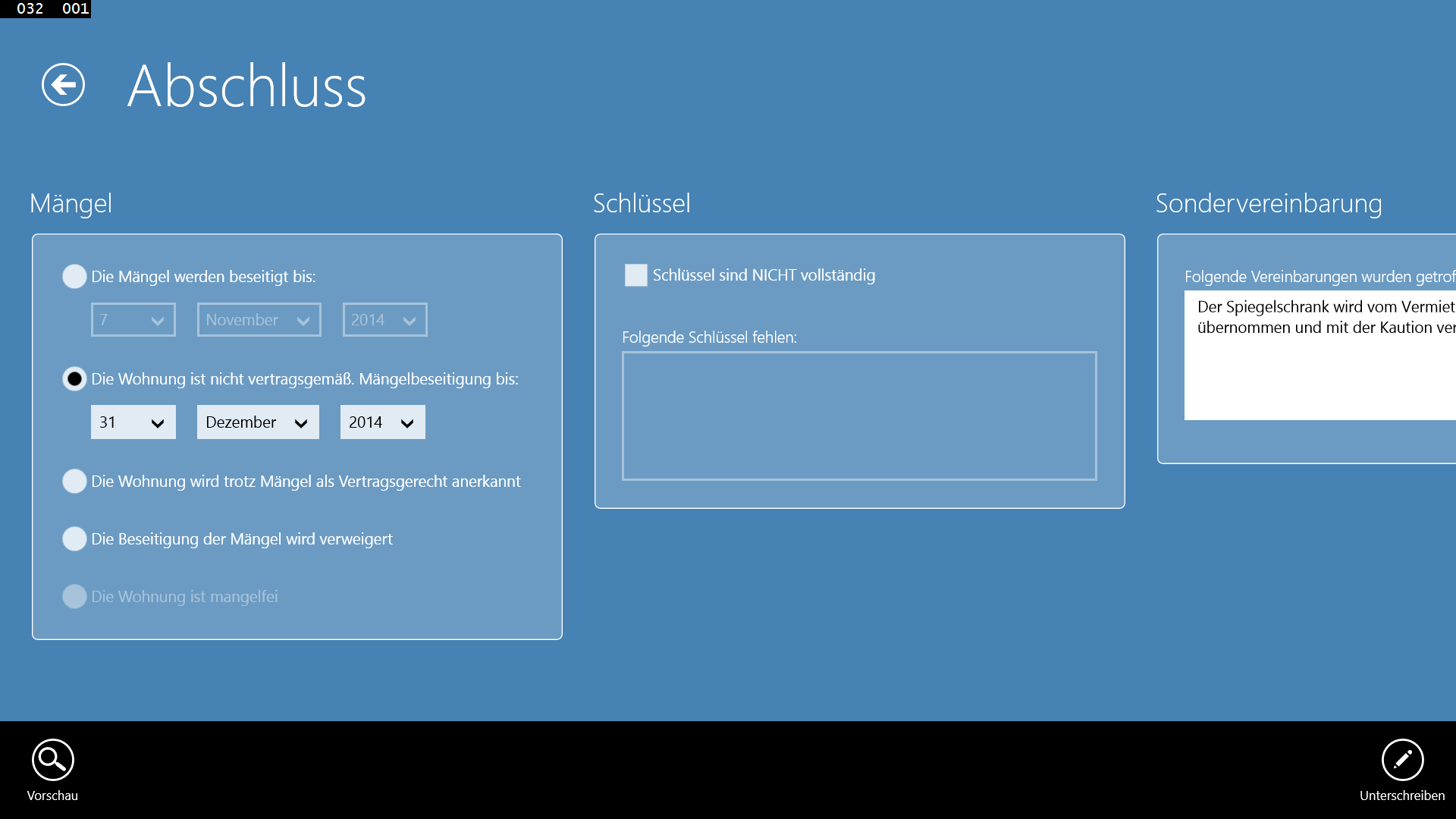 Legen Sie beliebig viele Mängel oder Austattungen an ...... und hierzu jeweils beliebig viele BilderErstellt ein übersichtliches und aussagekräftiges Übergabeprotokoll in PDF-FormatUnterschreiben Sie direkt in der APPKein Papierkram mehrFügen Sie dem Protokoll Ihr Firmenlogo hinzuBeschreiben Sie den genauen Zustand der Räume (Wände, Böden, Türen usw.)Speichern Sie Kontakte in Ihr Windows-Adressbuch