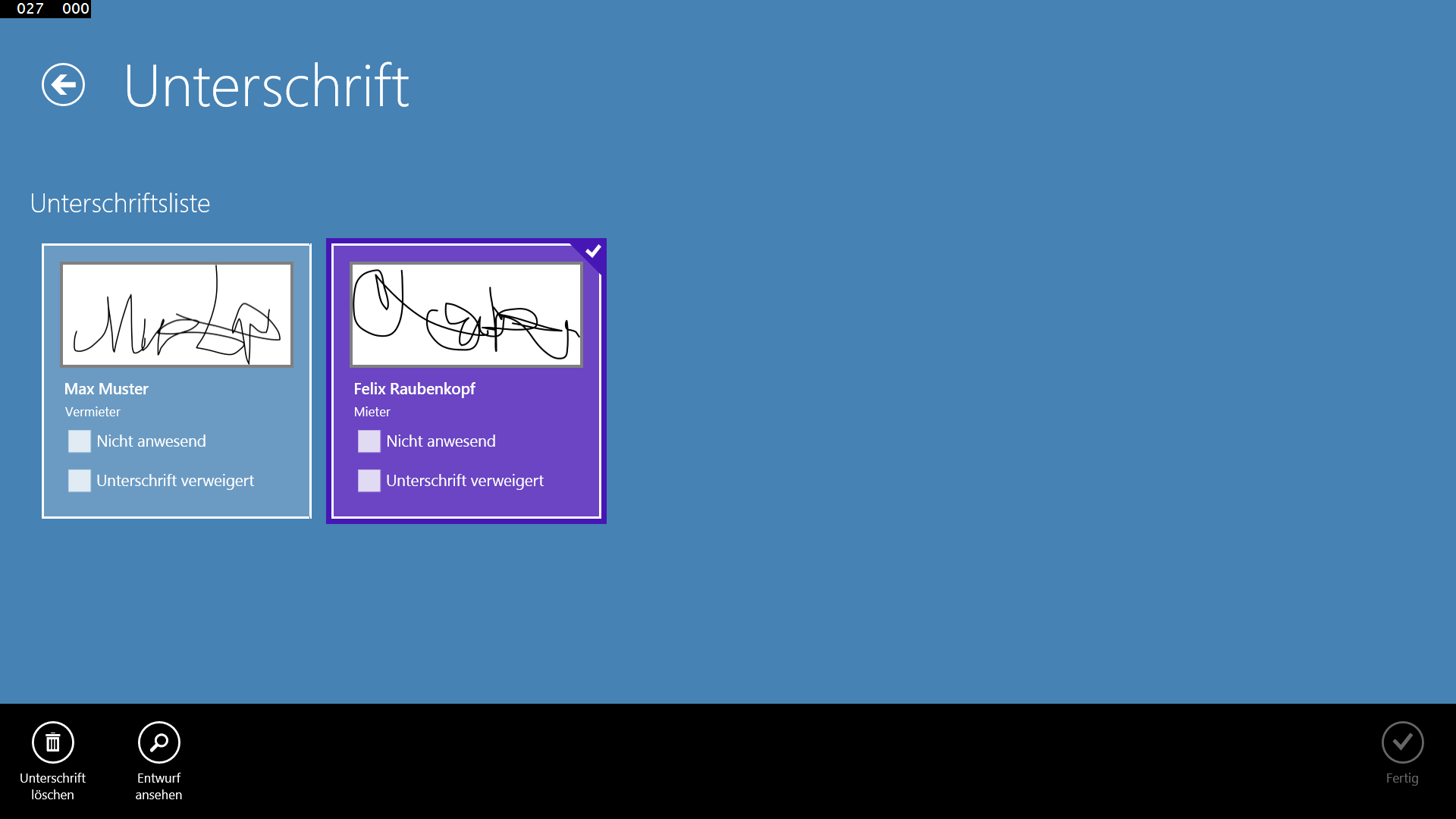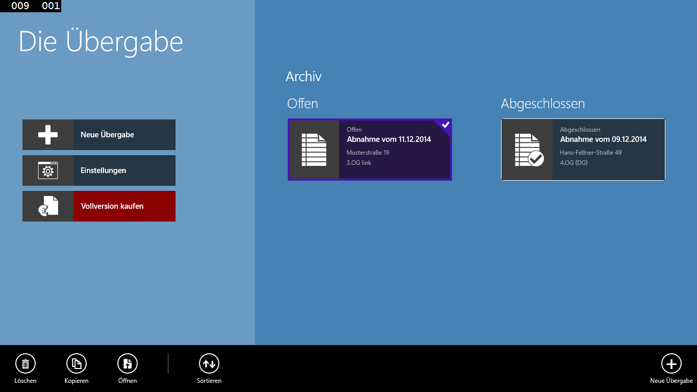 Die Testversion ist voll funktionsfähig. Die Übergabe kann allerdings nicht abgeschlossen werden, zudem können die Entwürfe nicht ausgedruckt werden. In der App haben Sie allerdings die Möglichkeit die Vollversion zu erweben um alle Einschränkungen aufzuheben.
