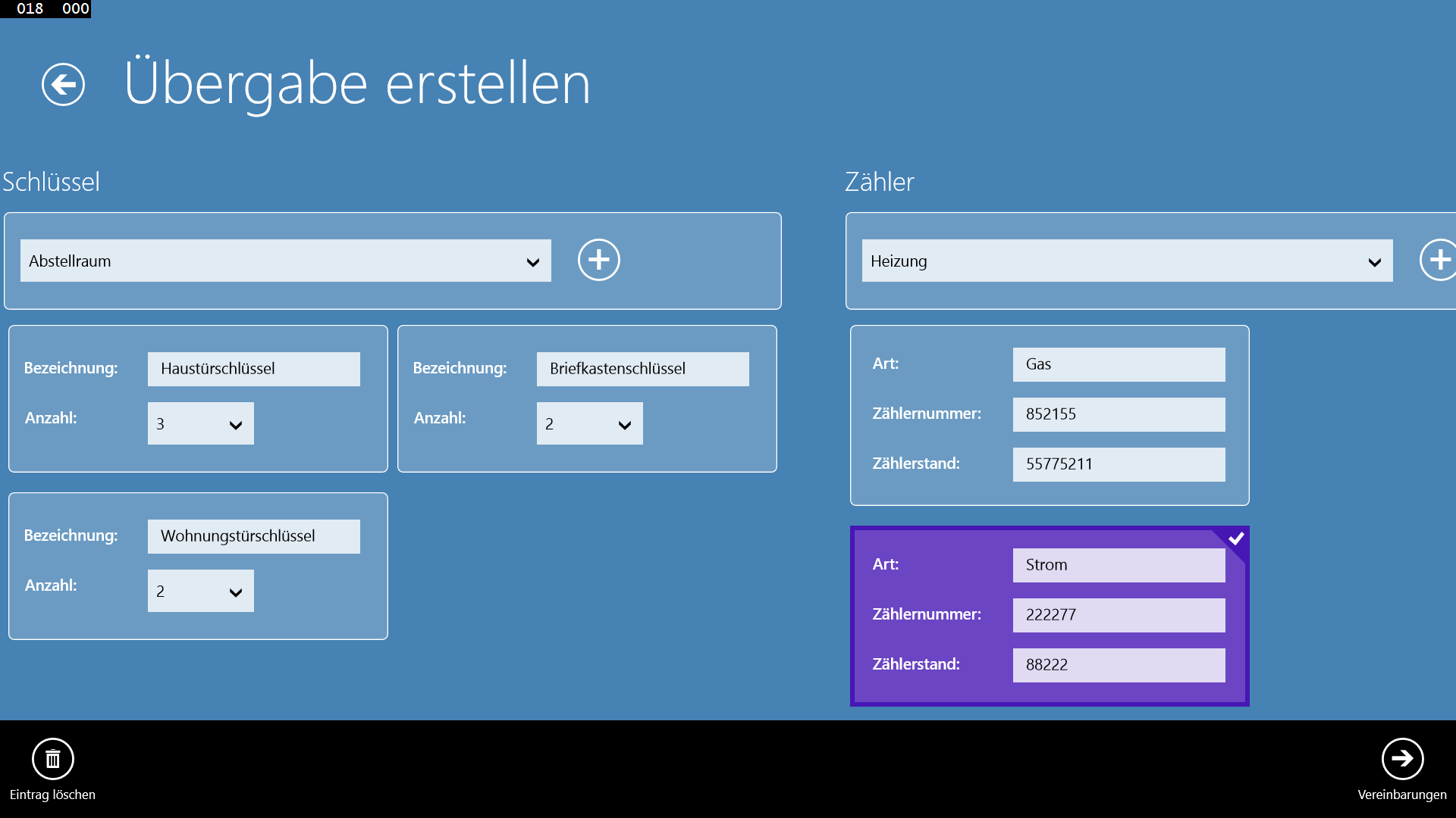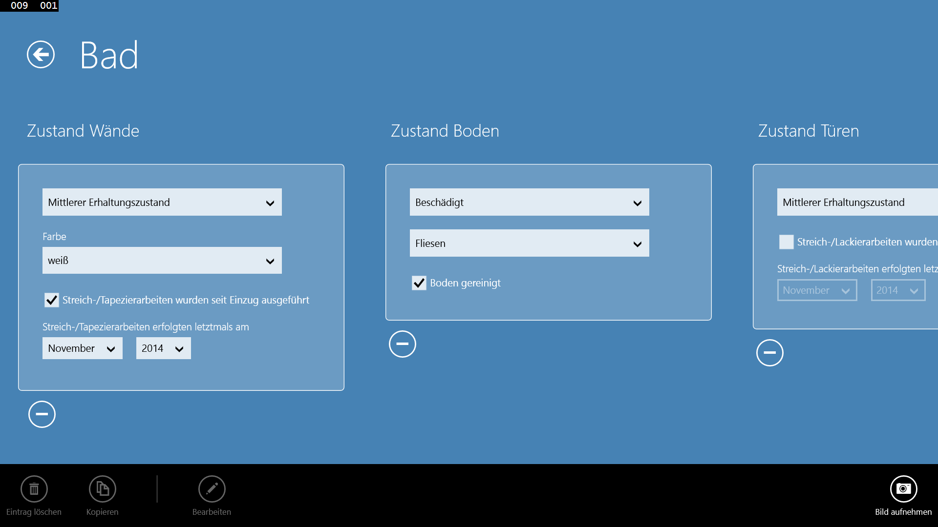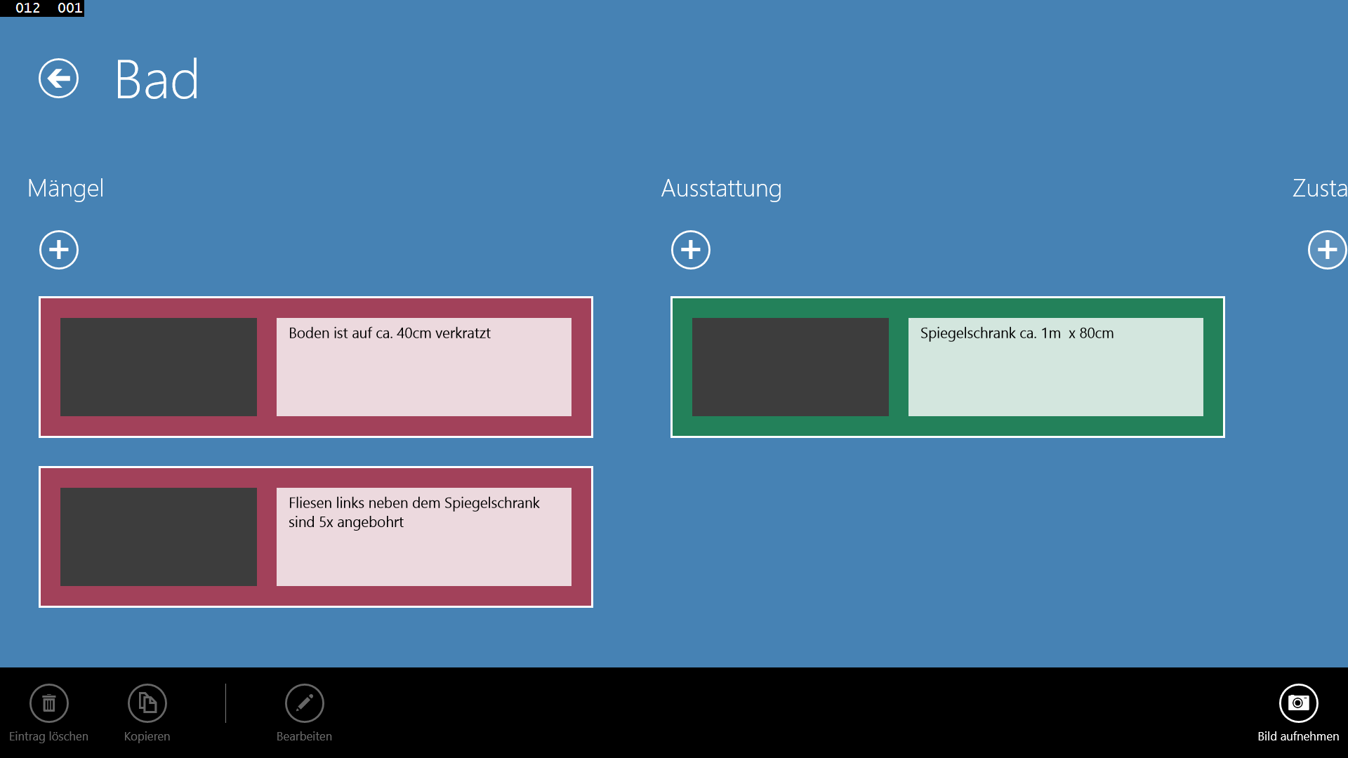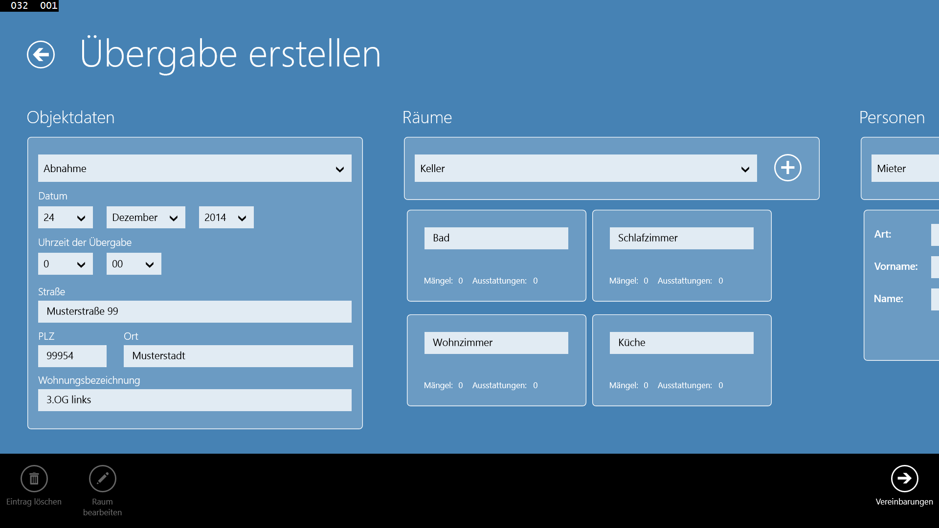 Sie können beliebig viele Räume pro Objekt anlegen und pro Objekt wiederum beliebig viele Mängel und Ausstattungsmerkmale (w.z.B. Einbauküche) anlegen. Zu den Mängeln und Austattung können Sie wiederum beliebig viele Bilder mit anfügen die Sie direkt über "Die Übergabe" aufnehmen können.