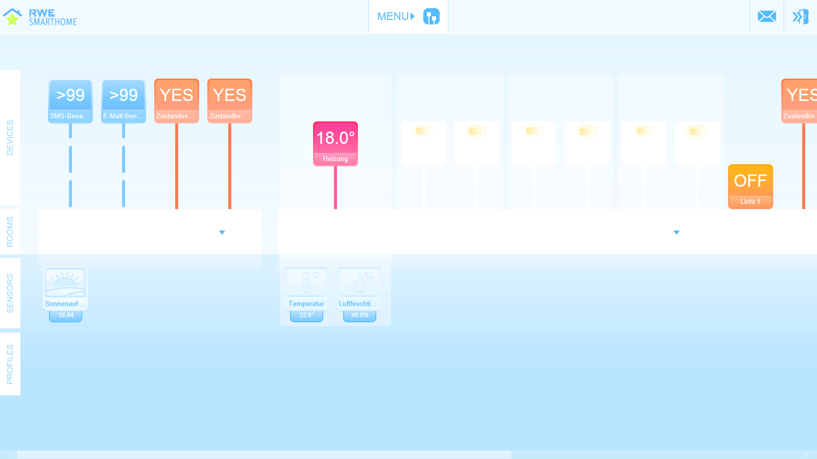 The app offers convenient access to your RWE SmartHome system. When log in for the first time, the log-in data can be saved in the settings and will then be available every time you access the system. The app not only allows you to control devices and switch profiles on and off, but also to view the condition of your rooms by means of the sensor data. Moreover, historical values of devices and sensors can be displayed. With RWE SmartHome, RWE International SE has developed an innovative home automation system for house owners and tenants, which combines energy conservation with more convenience and safety. Various actuators and triggers integrate your devices and radiators in the SmartHome system and enable you to control the devices via a single user interface.