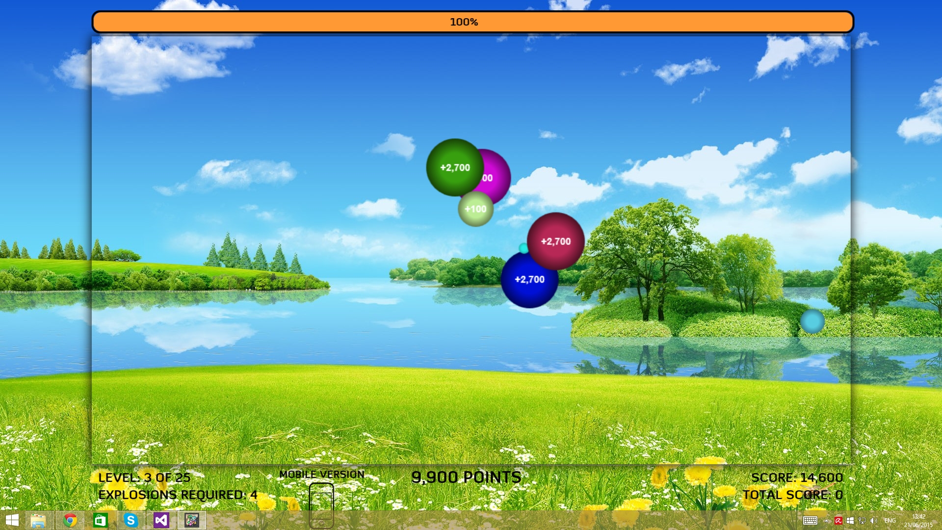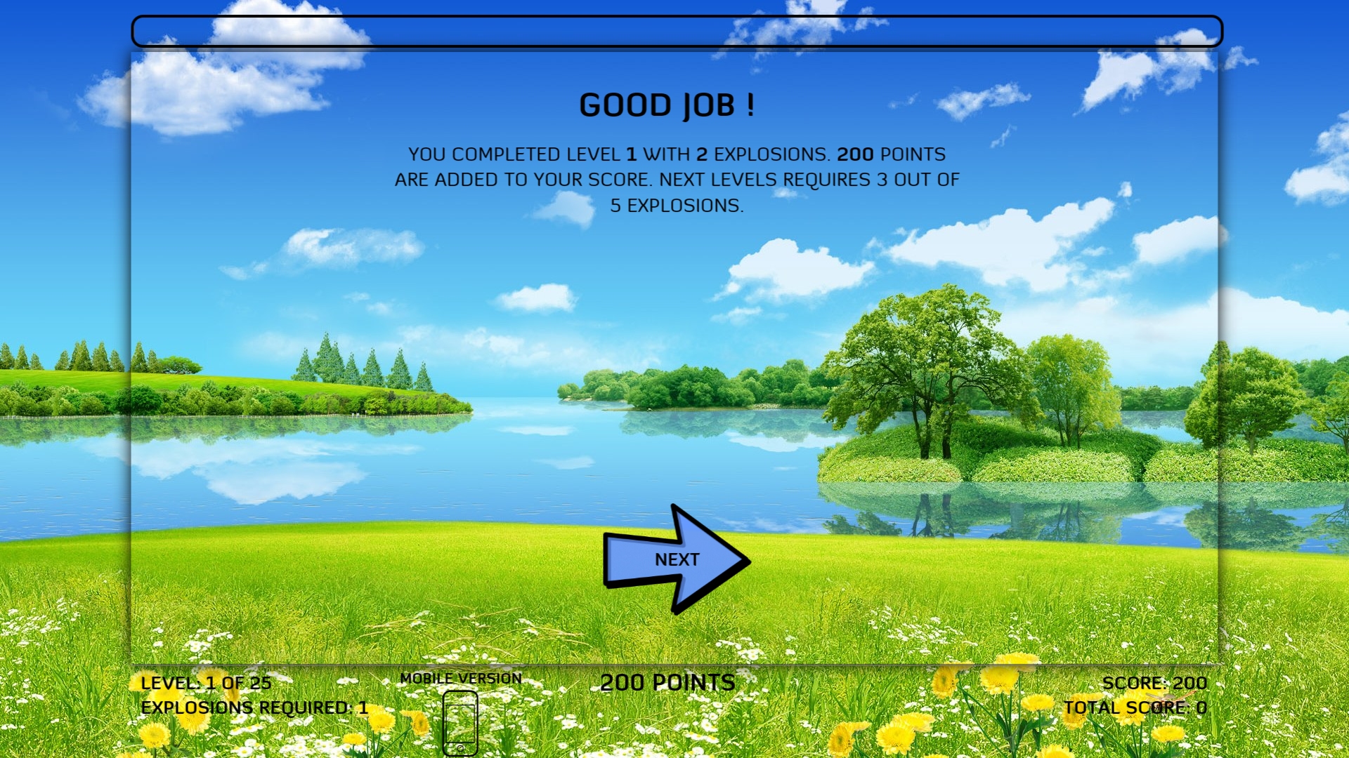 The best Chain Reaction game in the store. Make chain reactions, have fun and complete all 25 levels. You earn points only when completed all of them. It is not easy, so be prepared !
