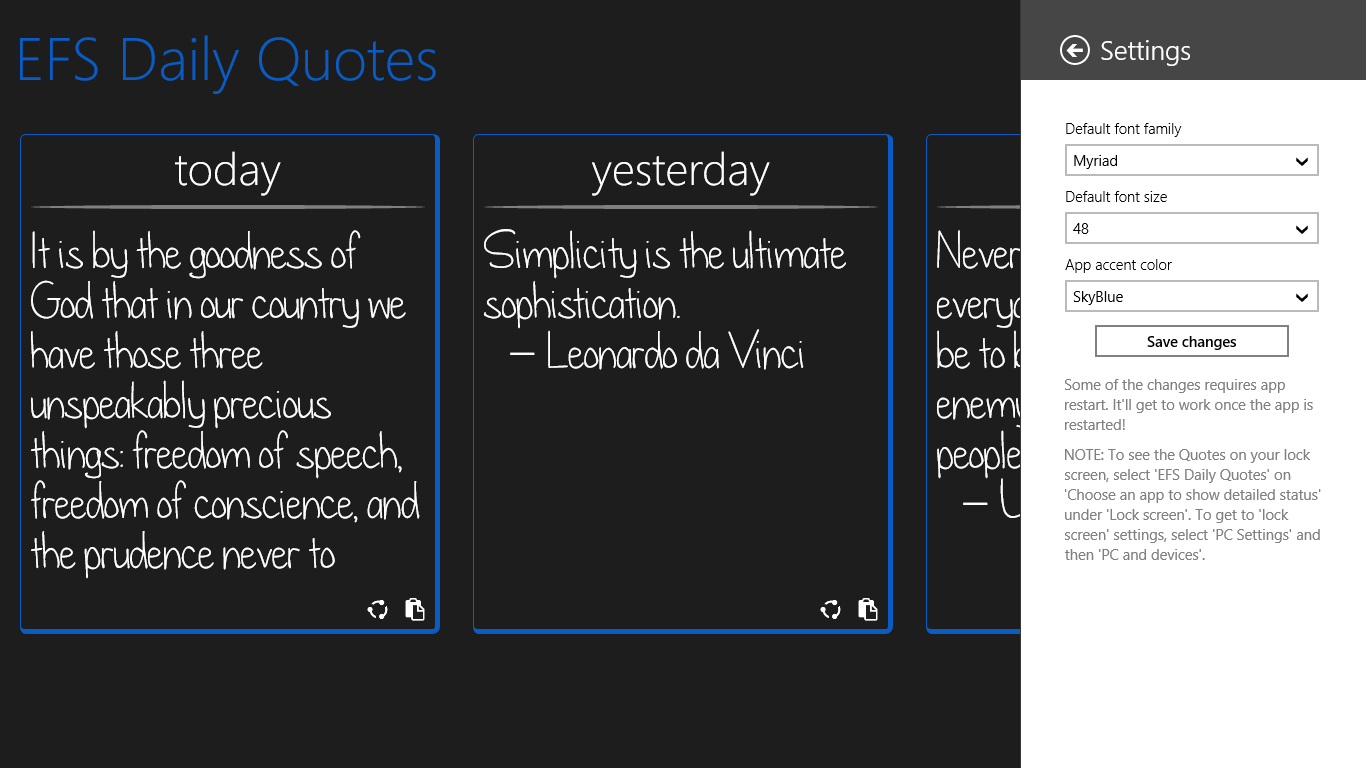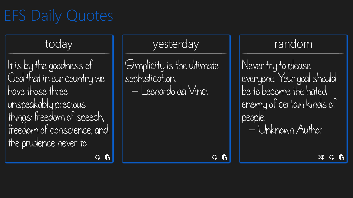 EFS Daily Quotes, a soothing application to start a day with, is developed carefully with an intention to provide inspiration at times of adversity or for a daily moment to rejuvenate.
