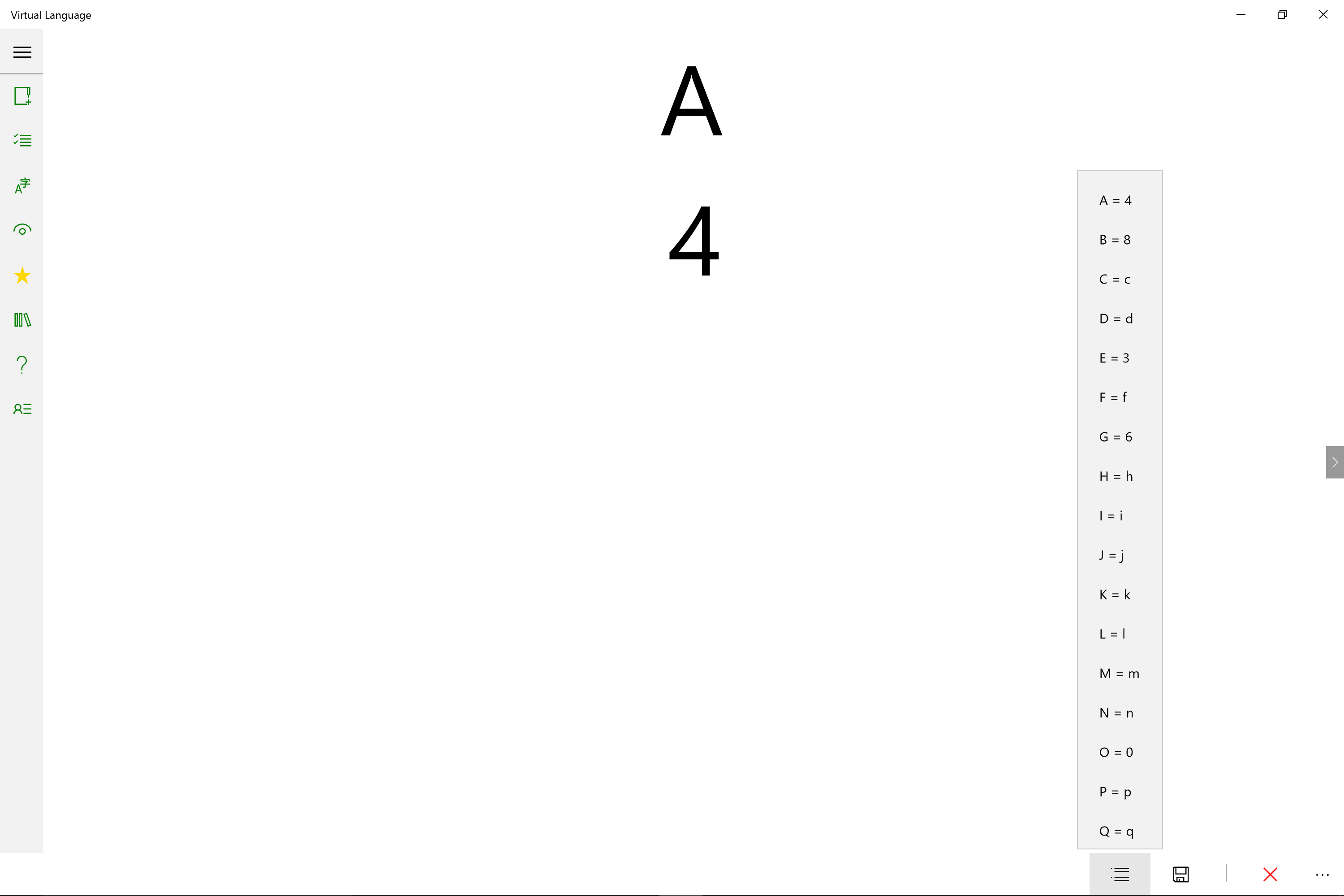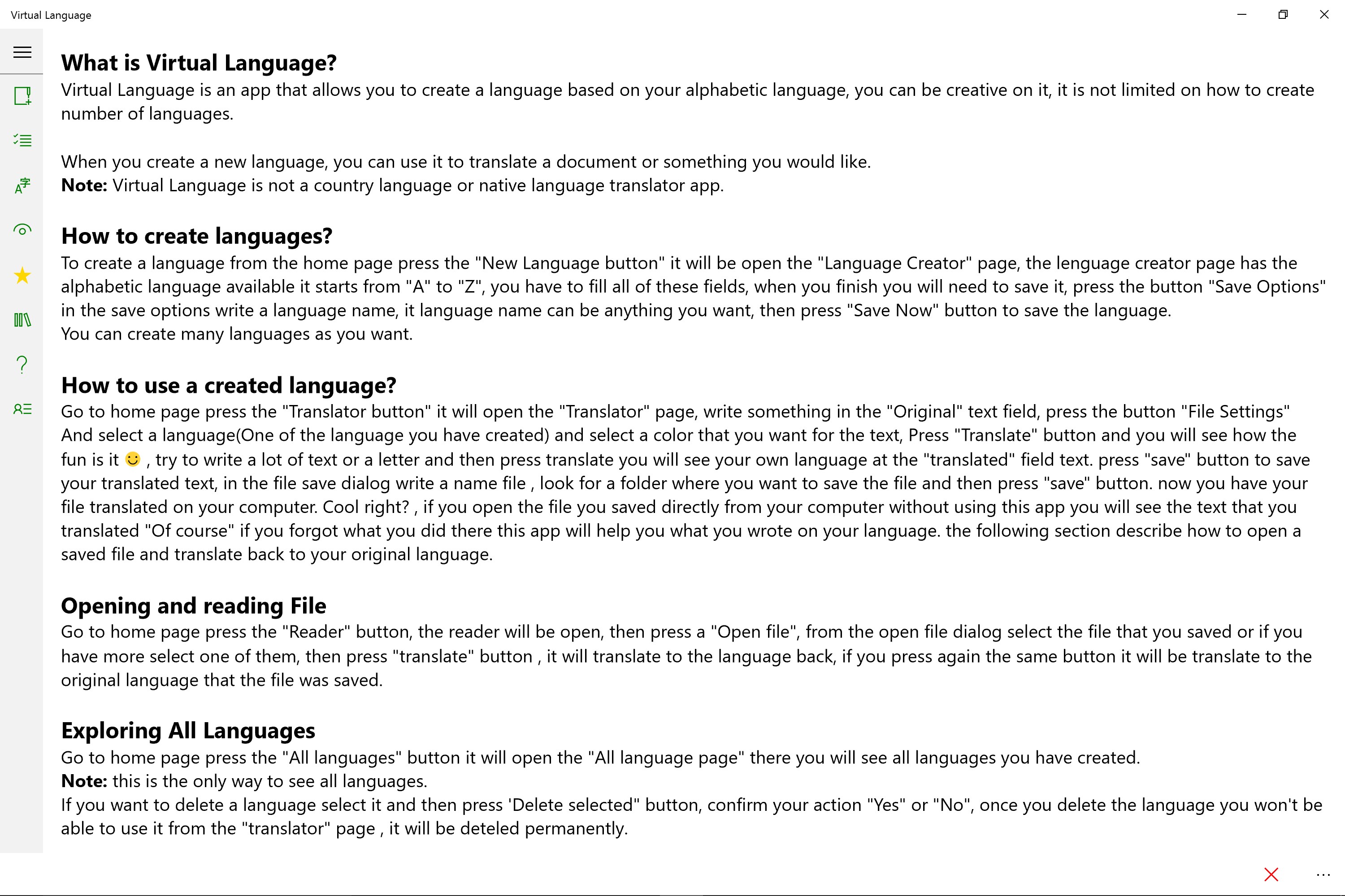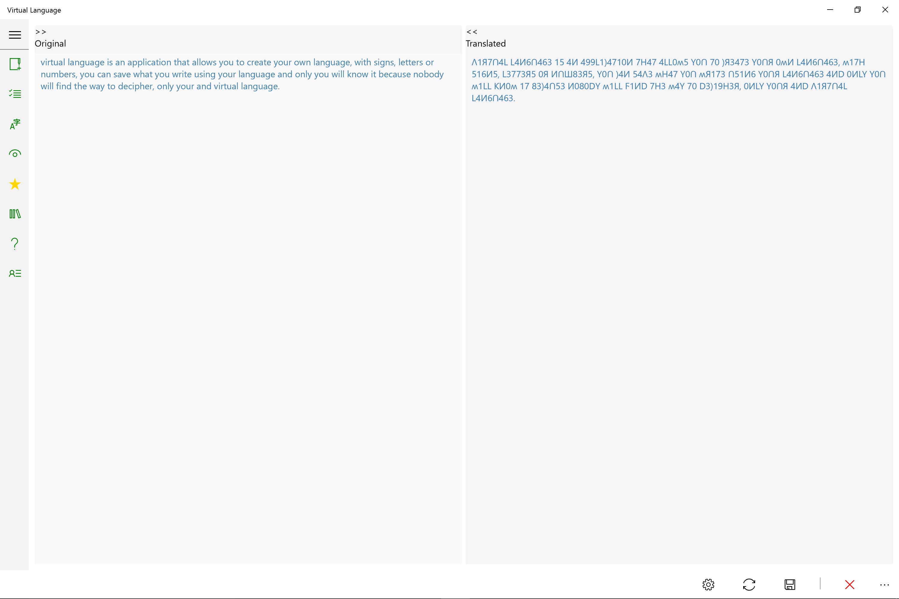 Virtual Language allows you to create language that you need, it hides the alphabet letter by the letter or sign you provide when you create a language. this app can help you to hide important information, or you can use it for fun, writing with your friends or family, you and the person who knows the language are using will be able to translate it, it works between you and the App. see example at : https://arrowat.app/virtuallanguage
