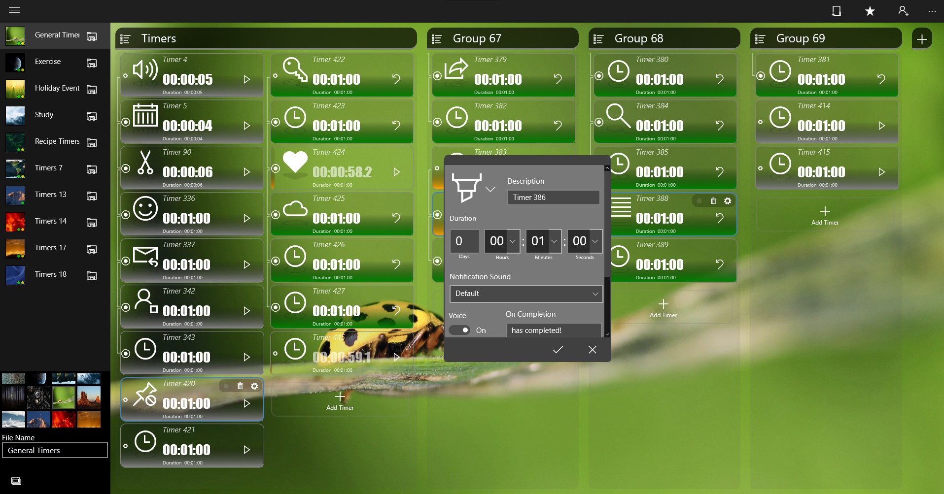 Setup multiple countdown timers for tracking activities. Timers use scheduled toast notification which enable notifications to happen in background even if app is not running. Features such as Linked timers, which allow for timers sequences and Voice notification required app to be running in foreground. Timers can be grouped together for organizing and linking.