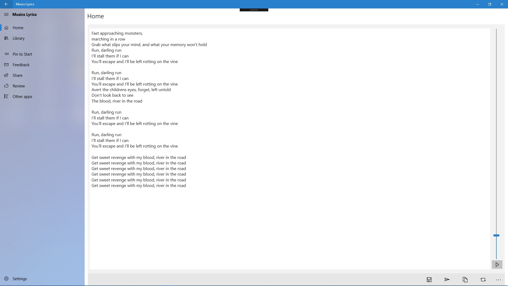 With this app you can found a lot of lyric and you can save it as text files , share it , or send it to a friend.