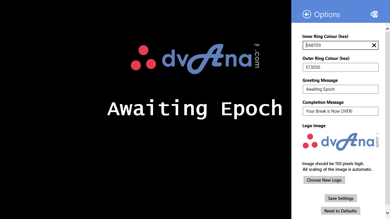 When unlocked you can change the Logo used on the display, from the Dvana logo, to your own. For best results, we recommend a logo 150 pixels high by whatever length you have or need. The app will scale them appropriately if needed. The correct size, will yield the clearest results.