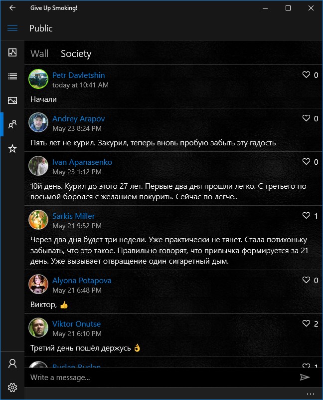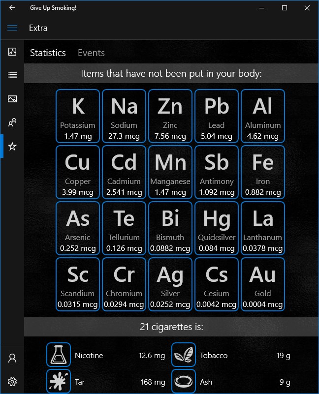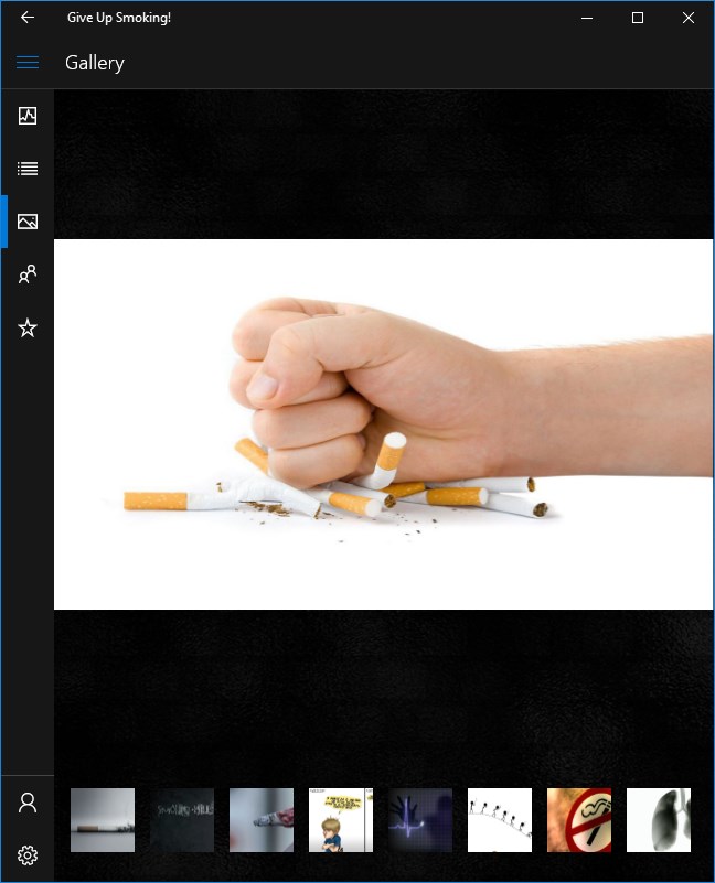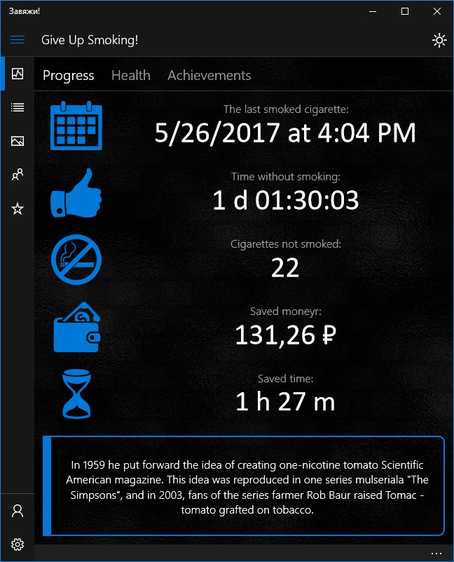 Also in this app you will find interesting facts and advice on fighting against the addiction, the live tile will show run-down.