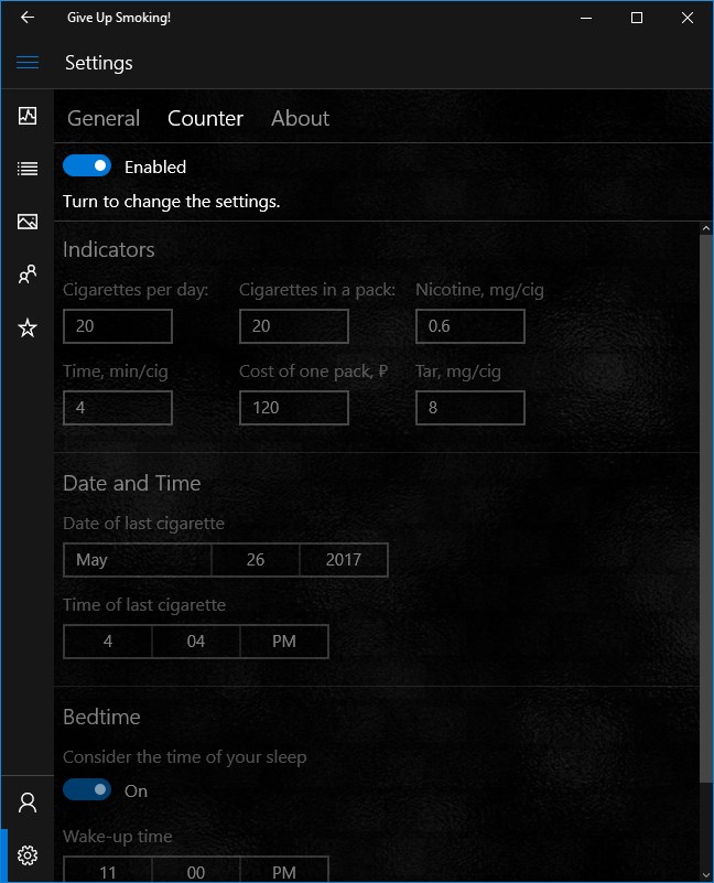 The app "Give Up Smoking!" isn't just a counter of the cigarettes which aren't smoked by you. The idea of the app is to help and provide detailed information in the course of fighting against smoking.
