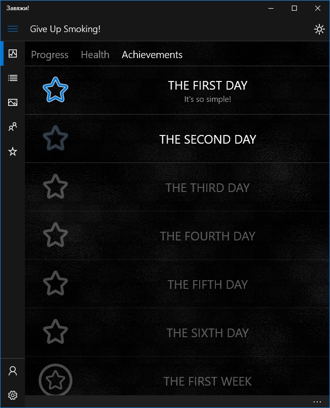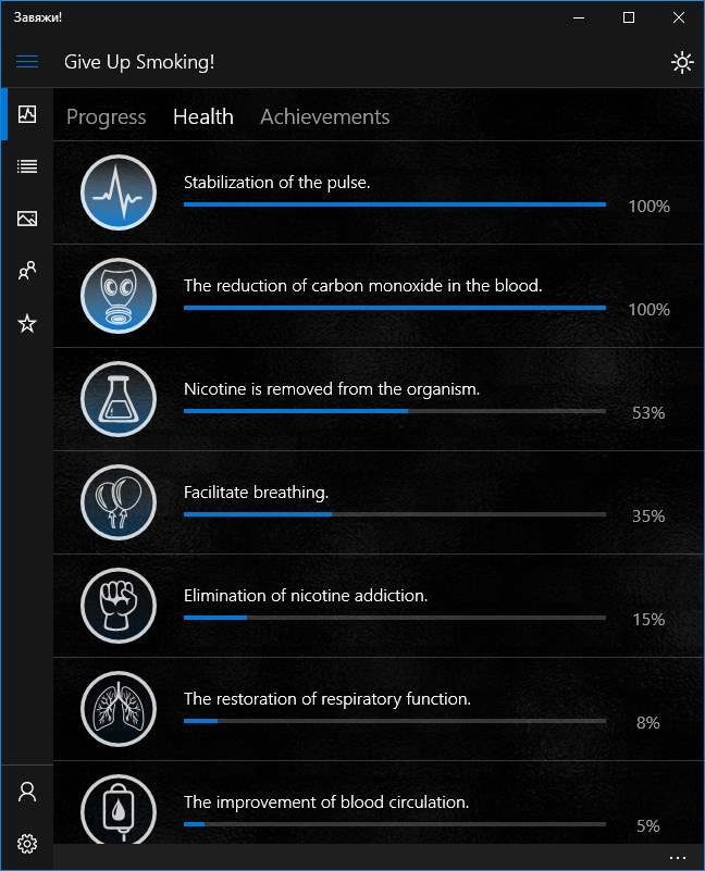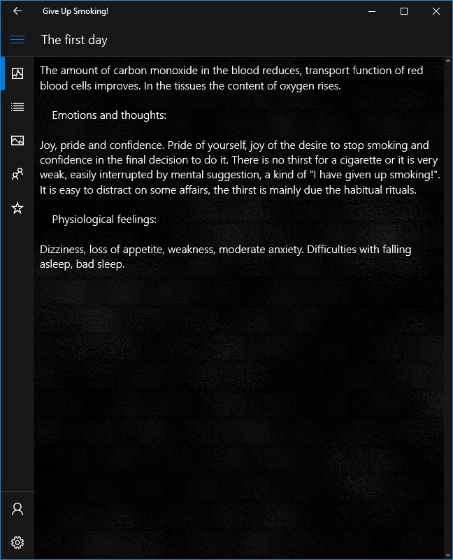 In your received achievements you will be able to find out what emotions / physiological feelings will expect you in the next period of giving up smoking. It is also some motivation.