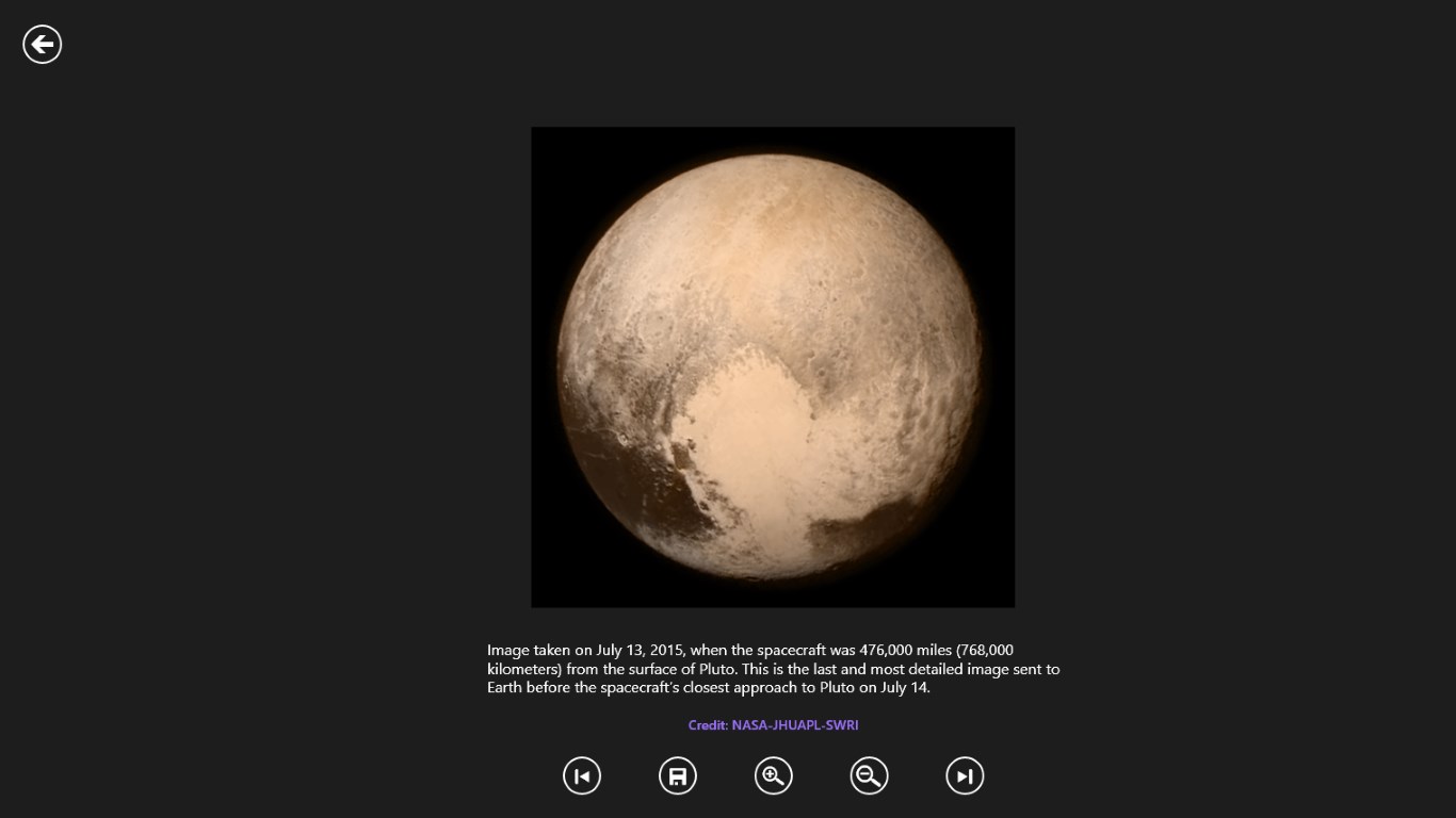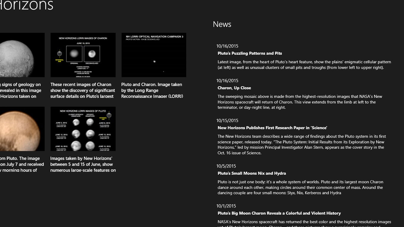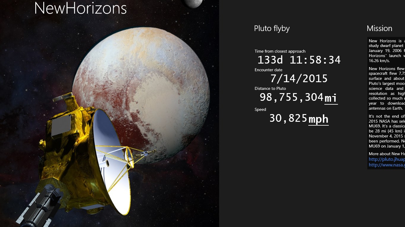 The application shows time elapsed from closest approach to Pluto, distance to that dwarf planet and speed of the probe. App shows also pictures taken by New Horizons and latest news from the mission team.